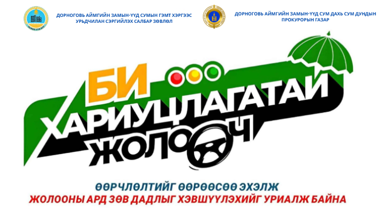 Замын хөдөлгөөний дүрмийг сайтар биелүүлж өөрийн болон бусдын амь нас, эрүүл мэндийг хамгаалахыг Дорноговь аймгийн Замын-Үүд сум дахь Сум дундын прокурорын газраас уриалж байна.