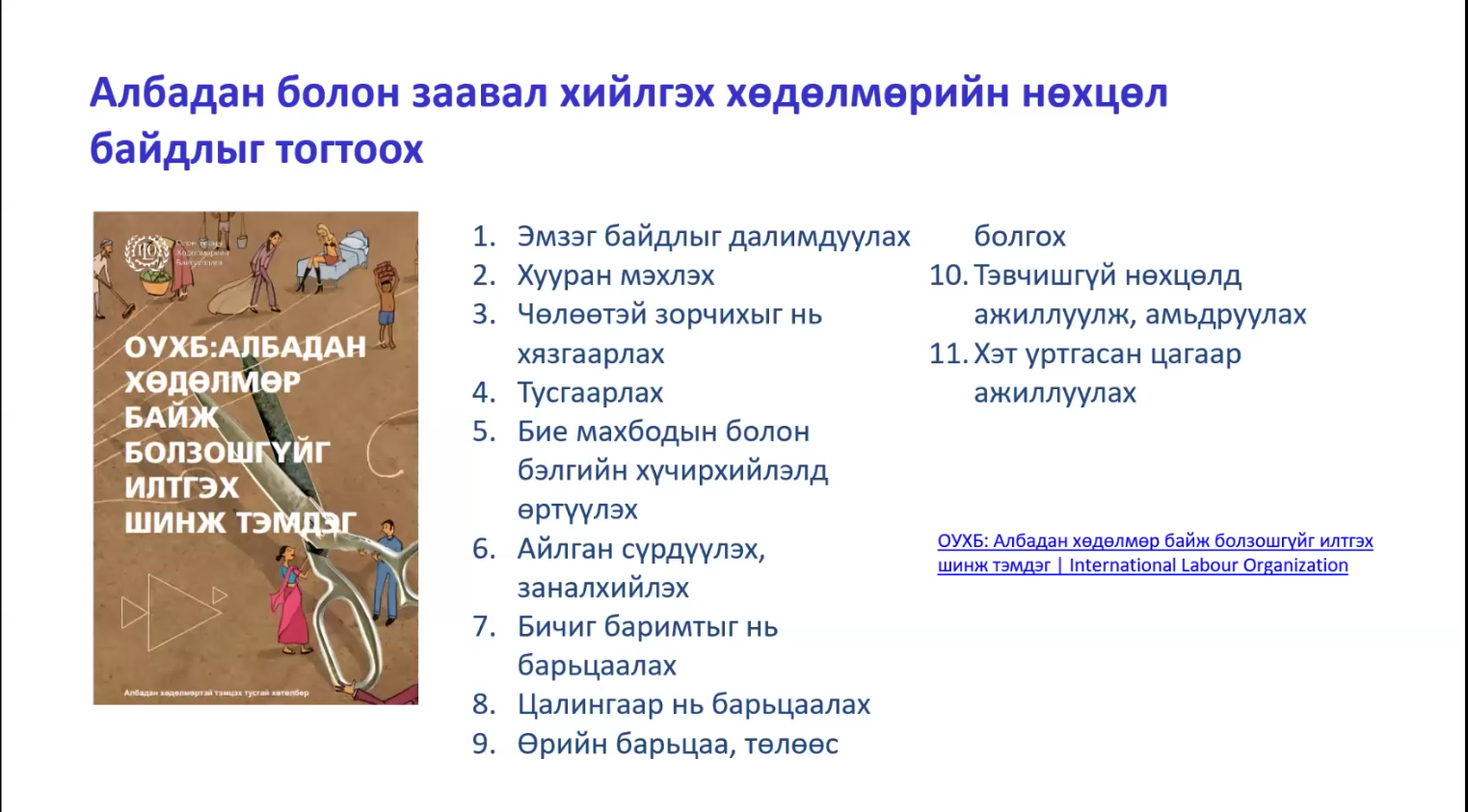 Улсын ерөнхий прокурорын газрын дэргэдэх Сургалт, судалгааны хүрээлэнгээс Олон улсын хөдөлмөрийн байгууллагатай хамтран “Хөдөлмөрлөх эрхийн олон улсын гэрээ, конвенц” сэдэвт сургалтыг зохион байгууллаа.