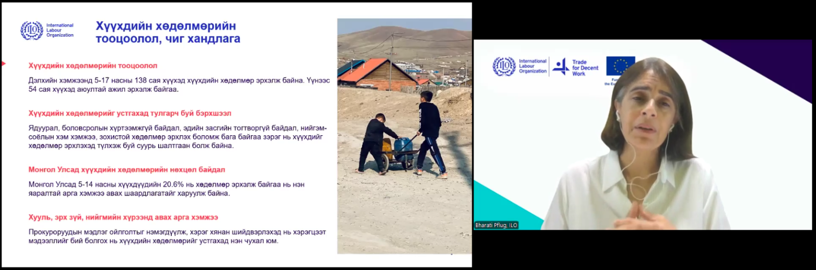 Сургалтад "Албадан хөдөлмөрийг устгах тухай олон улсын хөдөлмөрийн хэм хэмжээ, Албадан хөдөлмөрийн тухай ОУХБ-ын 1930 оны 29 дүгээр конвенцын 2014 оны протокол" сэдвээр ОУХБ-ын Ази, Номхон далайн бүсийн товчооны ахлах мэргэжилтэн Алайн Пельс, "Хүүхдийн хөдөлмөрөөс урьдчилан сэргийлж, хүүхдийн хөдөлмөрийг устгахад прокурорын байгууллагын оролцоо болон олон улсын сайн туршлага” сэдвээр ОУХБ-ын Ази, Номхон далайн бүсийн товчооны ахлах мэргэжилтэн Барати Флюг нар сургалт явуулж, прокурор, ажилтнуудын сонирхсон асуултад хариулж, харилцан ярилцав.