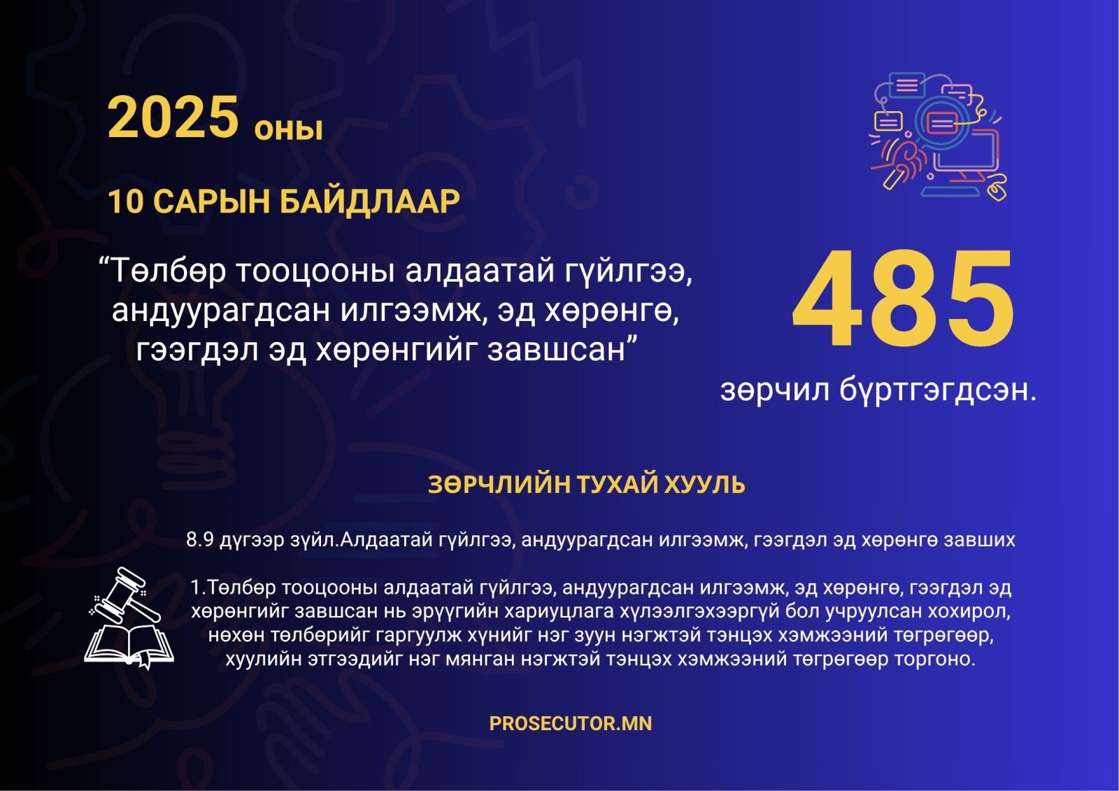 Прокурорын байгууллагаас Зөрчлийн тухай хуулийн 8.9 дүгээр зүйлийн 1 дэх хэсэгт заасан “Төлбөр тооцооны алдаатай гүйлгээ, андуурагдсан илгээмж, эд хөрөнгө, гээгдэл эд хөрөнгийг завшсан” зөрчлийг улсын хэмжээнд судалж үзэхэд, 2025 оны эхний 10 сарын байдлаар 485 зөрчил бүртгэгдсэн нь өмнөх оны мөн үеэс 120 буюу 32.9 хувиар өссөн байна.