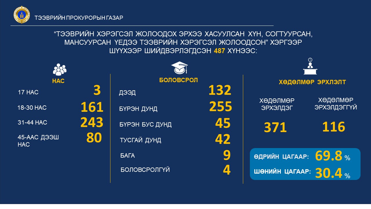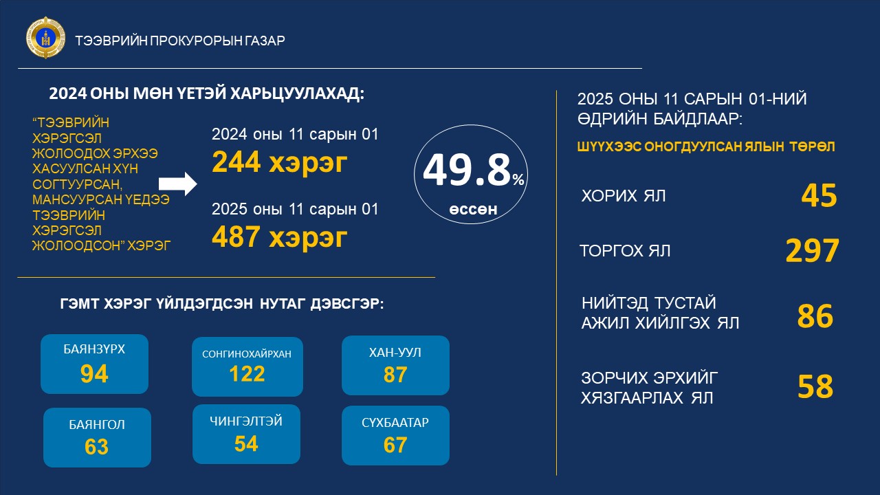 Тээврийн прокурорын газраас Эрүүгийн хуулийн 27.10 дугаар зүйлийн 5 дахь хэсэгт заасан “Тээврийн хэрэгсэл жолоодох эрхээ хасуулсан хүн согтуурсан, мансуурсан үедээ тээврийн хэрэгсэл жолоодсон” гэмт хэргийн гаралт, шүүхээс оногдуулж буй ял, шийтгэлийн байдлыг 2025 оны 11 сарын 01-ний өдрийн байдлаар судалжээ. Дээрх хугацаанд “Тээврийн хэрэгсэл жолоодох эрхээ хасуулсан хүн согтуурсан, мансуурсан үедээ тээврийн хэрэгсэл жолоодсон” 487 хүнд холбогдох хэргийг шүүхээр эцэслэн шийдвэрлүүлсэн нь өмнөх оны мөн үеэс 243 хэргээр буюу 49.8 хувиар өссөн байна.