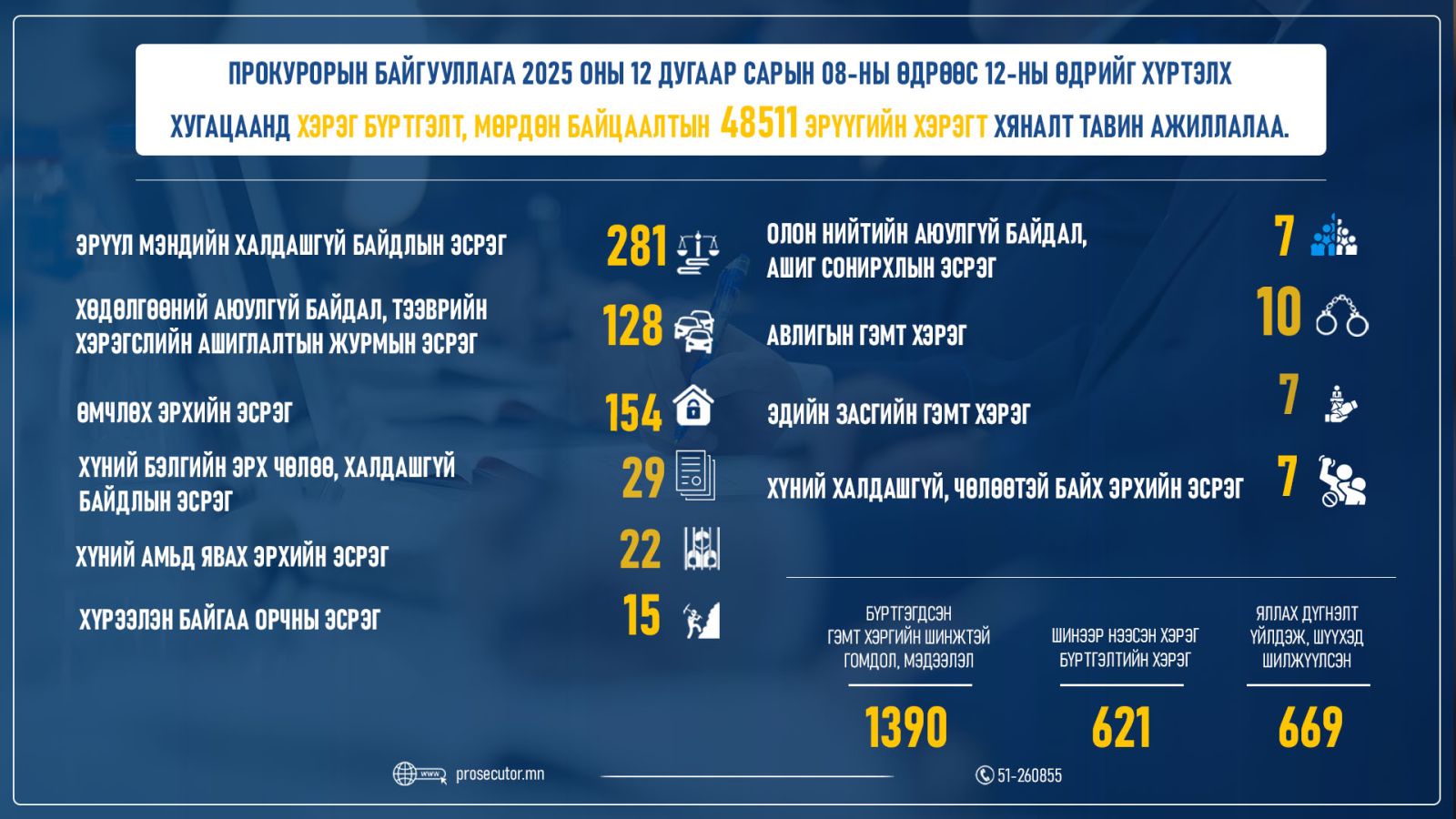 Прокурорын байгууллага 2025 оны 12 дугаар сарын 08-ны өдрөөс 12-ны өдрийг хүртэлх хугацаанд хэрэг бүртгэлт, мөрдөн байцаалтын 48511 эрүүгийн хэрэгт хяналт тавин ажиллажээ.