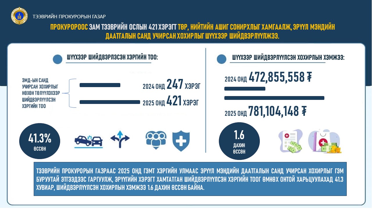Тээврийн прокурорын газраас 2025 оны жилийн эцсийн байдлаар Эрүүгийн хуулийн 27.10 дугаар зүйлд заасан тээврийн хэрэгслийн хөдөлгөөний аюулгүй байдал, ашиглалтын журам зөрчиж, бусдын эрүүл мэндэд хохирол учруулсан 652 хэргийг шүүхээр шийдвэрлүүлснээс 421 хэрэгт Эрүүл мэндийн даатгалын санд учирсан 781 сая төгрөгийн хохирлыг гэм буруутай этгээдээр нөхөн төлүүлэхээр шийдвэрлүүлжээ.