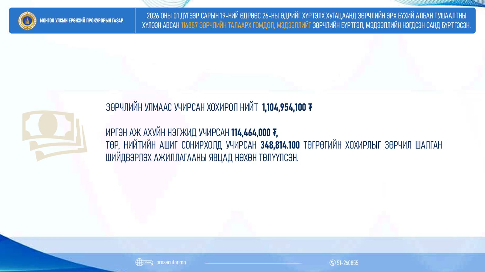 Зөрчлийн улмаас нийт 1,104,954,100 төгрөгийн хохирол учирснаас иргэн аж ахуйн нэгжид учирсан 114,464,000, төр, нийтийн ашиг сонирхолд учирсан 348,814,100 төгрөгийн хохирлыг зөрчил шалган шийдвэрлэх ажиллагааны явцад нөхөн төлүүлжээ.