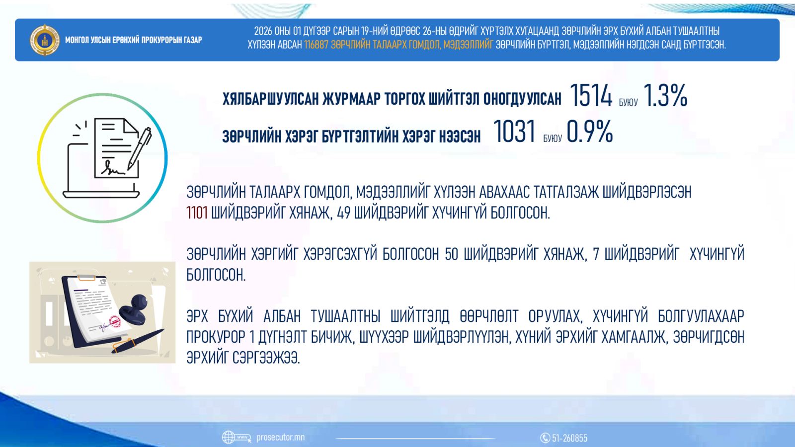 Прокурорын байгууллага 2026 оны 01 дугаар сарын 19-ний өдрөөс 2026 оны 01 дүгээр сарын 26-ны өдрийг хүртэл хугацаанд улсын хэмжээнд зөрчил шалган шийдвэрлэх эрх бүхий албан тушаалтны хүлээн авсан 116,887 зөрчлийн талаарх гомдол, мэдээллийг зөрчлийн бүртгэл, мэдээллийн нэгдсэн санд бүртгэжээ.