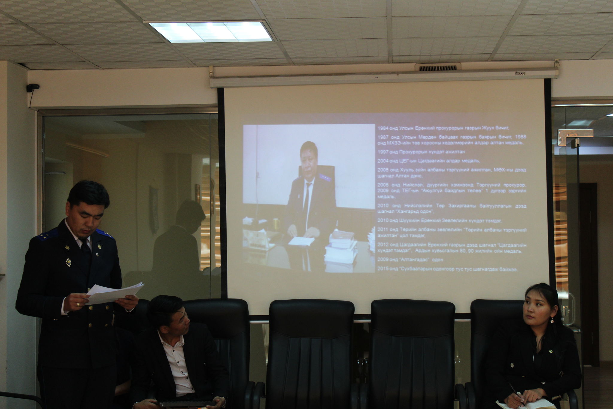 Хан-Уул дүүргийн прокурорын газраас 2018 оны 09 дүгээр сарын 27-ны намрын дунд цагаагчин тахиа сарын билэгт сайн өдөр Д.Сүхбаатарын одонт, ахмад прокурор Ерөөлтийн Сагсайг урьж, уулзалтын арга хэмжээг зохион байгуулан, хүндэтгэл үзүүллээ.