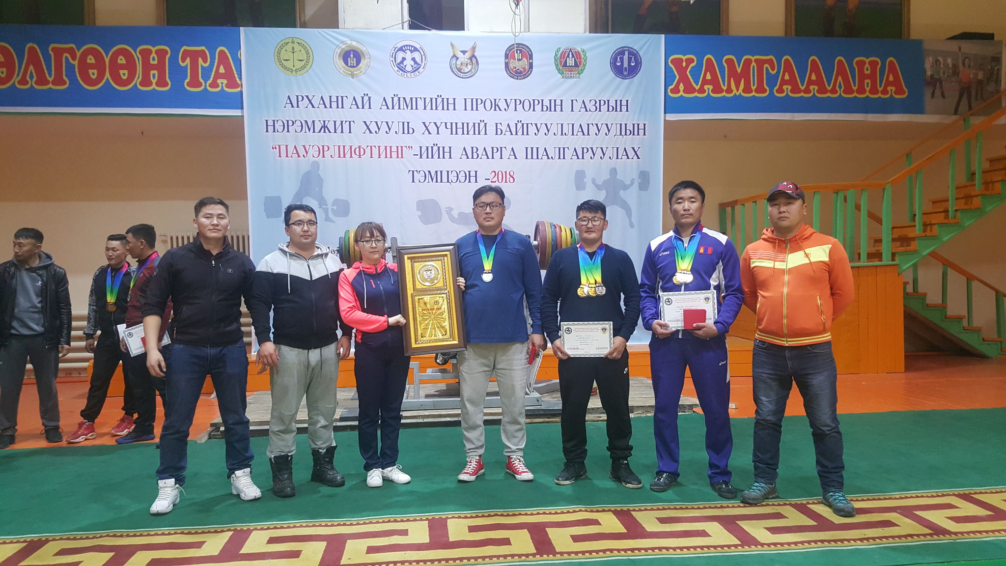 Архангай аймгийн прокурорын газрын Биеийн тамир спортын салбар зөвлөлөөс 2018 онд хийж гүйцэтгэх ажлын төлөвлөгөөнд тусгагдсаны дагуу тус аймагт үйл ажиллагаа явуулж буй Хууль, хүчний байгууллагуудын дунд жил бүр уламжлал болон зохион байгуулагддаг “Пауэрлифтинг”-ийн аварга шалгаруулах тэмцээнийг Архангай аймгийн Пауэрлифтингийн холбоо, Биеийн тамир спортын газартай хамтран энэ сарын 21-ний өдөр амжилттай зохион байгууллаа. Тэмцээнд 8 байгууллагын 40 гаруй тамирчид 5 жинд 66 багц медалийн төлөө өрсөлдөж, хяналтын прокурор Б.Буяндалай +93 кг-ийн жинд суултын төрөлд алт, таталтын төрөлд алт, шахалтын төрөлд хүрэл, нийлбэр дүнгээр мөнгөн медаль, хяналтын прокурор С.Батсүх +93 кг-ийн жинд суултын төрөлд хүрэл медаль, эрүүгийн хэргийн архивч, програмист Д.Болд-Эрдэнэ -93 кг-ийн жинд суултын төрөлд 4-р байр, шахалтын төрөлд хүрэл, таталтын төрөлд алт, нийлбэр дүнгээр мөнгөн медаль тус тус хүртэж багийн дүнгээр 2-р байр эзэлж өргөмжлөл, үнэ бүхий зүйлээр шагнуулсан байна. АРХАНГАЙ АЙМГИЙН ПРОКУРОРЫН ГАЗРААС МЭДЭЭЛЭВ.