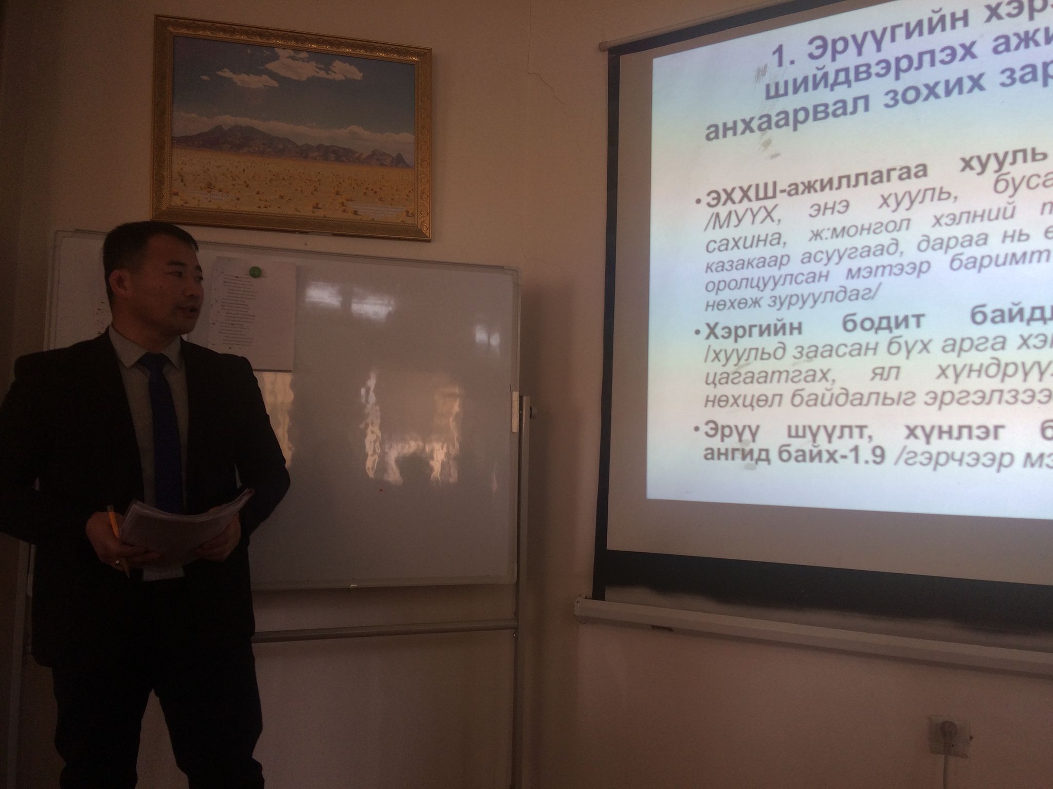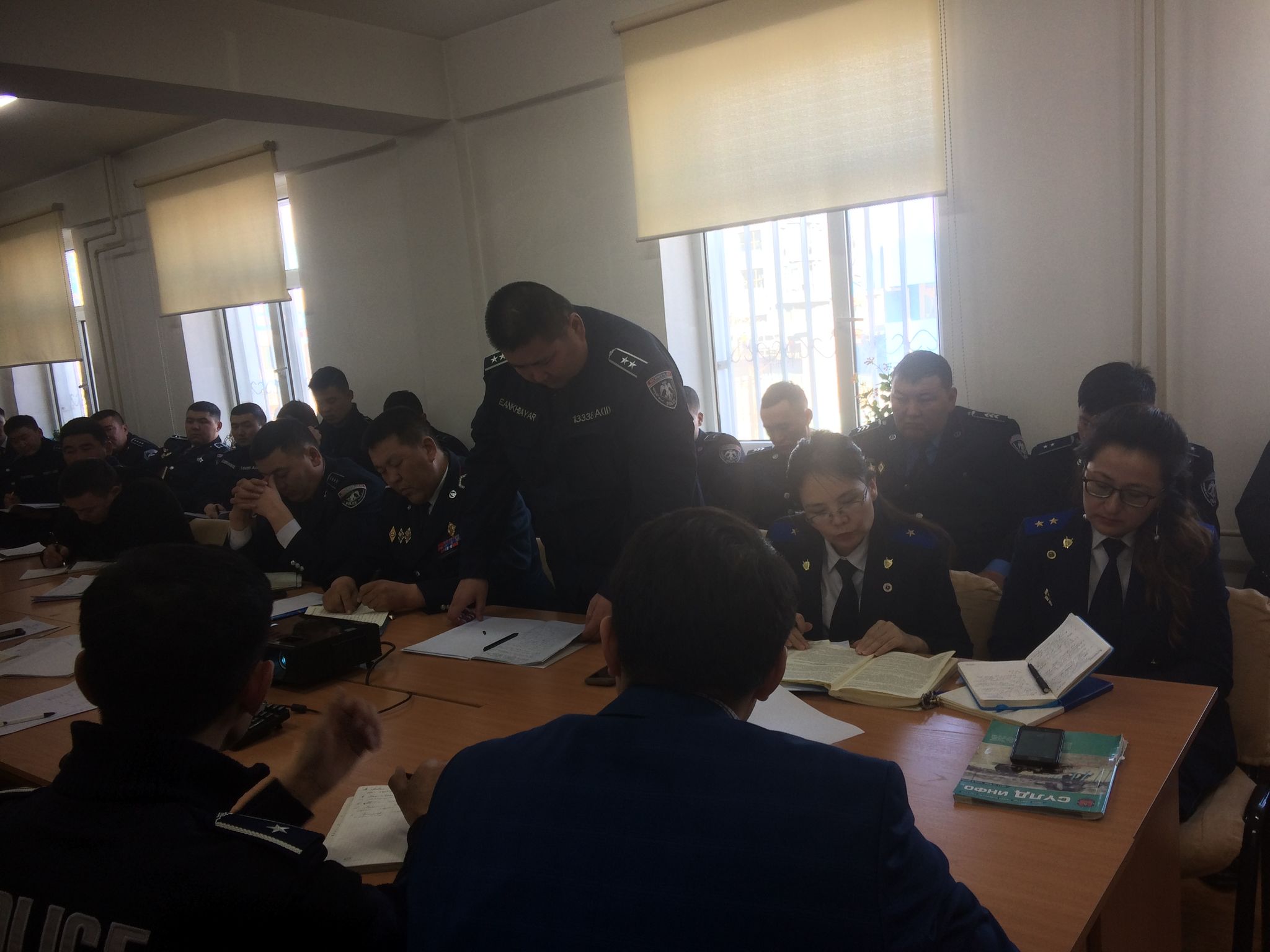 Зөрчлийн эрх бүхий албан тушаалтнуудтай хийсэн сургалт зөвлөгөөнөөр хяналтын прокурор Б.Ботакөз 2018 онд зөрчил шалган шийдвэрлэх ажиллагаанд хяналт тавих чиглэлээр аймгийн прокурорын газраас авч хэрэгжүүлсэн арга хэмжээ, аргачилсан зааврын хэрэгжилт, Зөрчлийн хуулийн хэрэгжилтийг зохион байгуулахаар аймаг дахь Цагдаагийн газрын Замын цагдаагийн тасаг, Нийтийн хэв журам хамгаалах тасгаас авч хэрэгжүүлсэн арга хэмжээ, гарч буй хүндрэл бэрхшээлтэй асуудал сэдвээр тус тус тасгийн дарга нар мэдээлэл тавьж, Зөрчлийн тухай хууль, Зөрчил шалган шийдвэрлэх тухай хуулиудыг хэрэгжилтийн талаар хэлэлцэв.