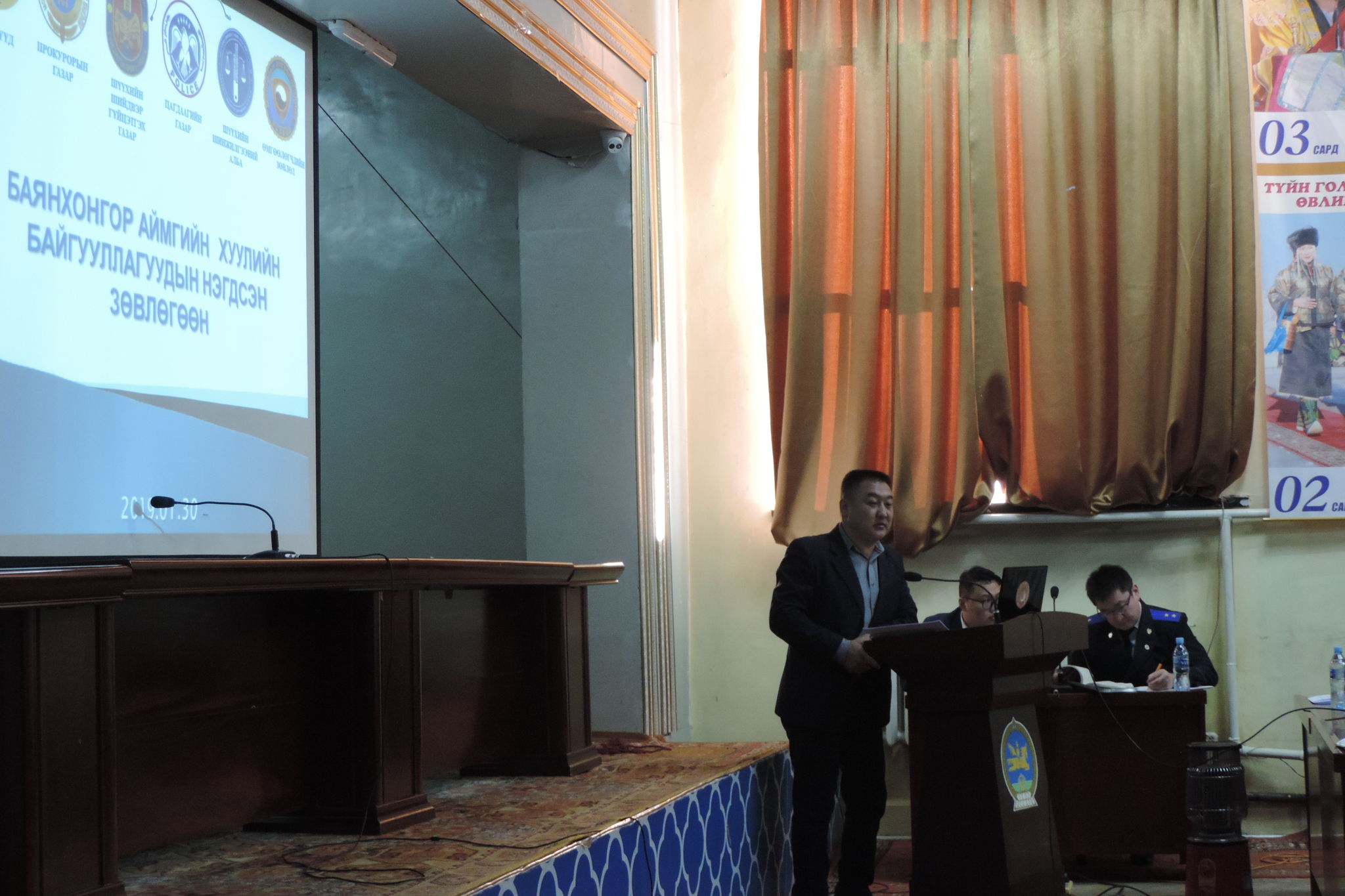 Баянхонгор аймгийн Прокурорын газраас санаачлан “Хуулийн байгууллагуудын нэгдсэн зөвлөгөөн”-ийг зохион байгууллаа. Зөвлөгөөнд Баянхонгор аймгийн Прокурорын газар, Баянхонгор аймгийн Эрүү, иргэний хэргийн давж заалдах шатны шүүх, Баянхонгор аймаг дахь Сум дундын Эрүүгийн хэргийн анхан шатны шүүх, Цагдаагийн газар, Шүүхийн шийдвэр гүйцэтгэх газар, Шүүхийн шинжилгээний алба, Өмгөөлөгчдийн зөвлөлийн удирдлагууд, шүүгч, прокурор, мөрдөгч, шинжээч, өмгөөлөгч, хуульчид оролцжээ.
