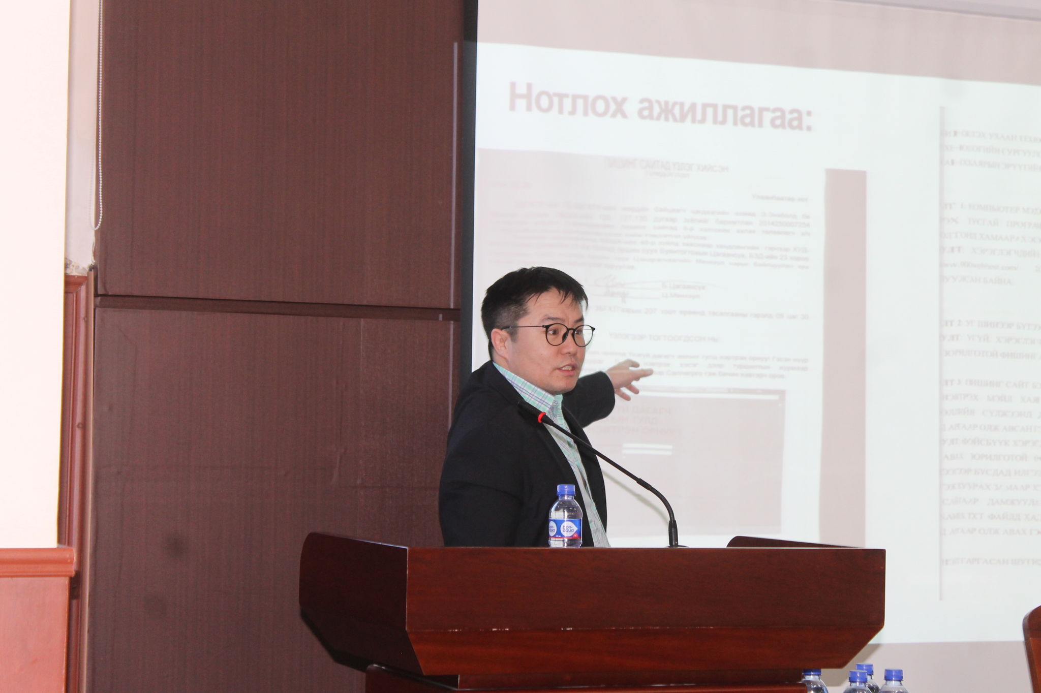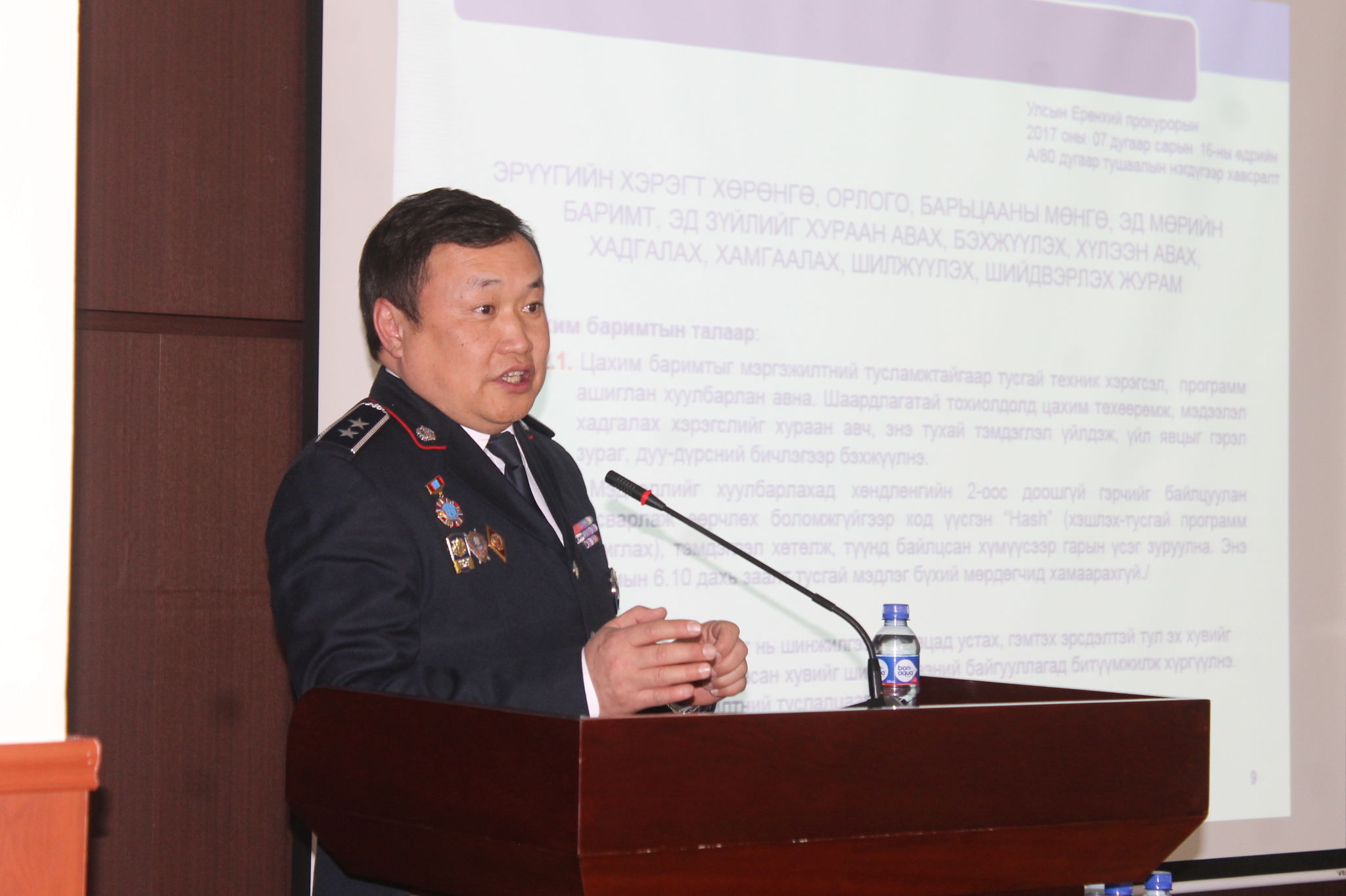 Сургалт, судалгааны төвийн судлаач багш, хяналтын прокурор Г.Оюунболд нь “Эрүүгийн хуулийн 26 дугаар бүлэгт заасан /Цахим мэдээлэлд хууль бусаар халдах, цахим мэдээллийн сүлжээнд хууль бусаар халдах программ, техник хэрэгсэл бэлтгэх, борлуулах, хор хөнөөлт программ хангамж бүтээх, ашиглах, тараах/ гэмт хэргийн зүйлчлэл, нотлох ажиллагаа, прокурорын яллах дүгнэлт үйлдэхэд анхаарах асуудал” сэдвээр;