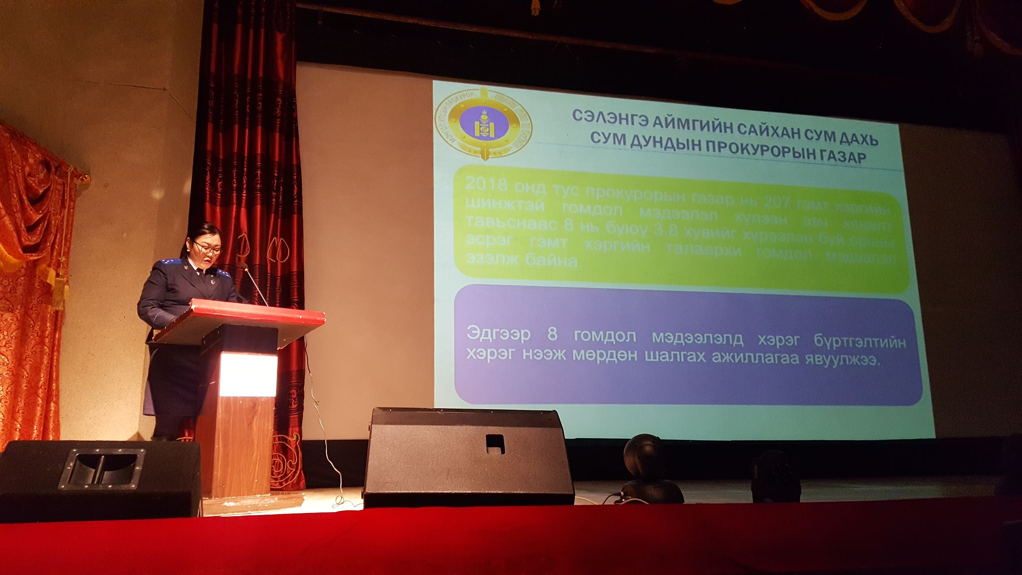 Сэлэнгэ аймгийн Сайхан сум дахь засаг даргын Тамгын газар, тус сум дахь Сум дундын прокурорын газраас хамтран “Хууль сурталчилах өдөрлөг-2019” арга хэмжээг 2019 оны 03 дугаар сарын 22-ны өдөр зохион байгууллаа. Өдөрлөгийн хүрээнд хууль, хяналтын байгууллагууд болон 12 албан байгууллага, нэгжүүдэд мэдээлэл хүргэн, Төрийн албаны тухай хууль, Зөрчлийн тухай хууль болон холбогдох хууль тогтоомжуудаар яриа хийж иргэдэд танилцуулга хийлээ. Тус сум дундын прокурорын газраас хяналтын прокурор Н.Бадам “Мансууруулах, сэтгэцэд нөлөөт бодистой холбоотой гэмт хэргийн нөхцөл байдал, урьдчилан сэргийлэх асуудал”, хяналтын прокурор Т.Дэлгэрсайхан “Хүрээлэн буй орчны гэмт хэрэг, зөрчил түүнээс урьдчилан сэргийлэх асуудал” гэх сэдвүүдээр тус тус мэдээлэл хийж оролцсон байна. Мөн Монгол улс дахь мансууруулах бодис, сэтгэцэд нөлөөт эм, хүрээлэн буй орчны эсрэг гэмт хэргийн өнөөгийн нөхцөл байдал болон, иргэд, сайн дурын байгууллагууд бууруулахад хэрхэн хамтран ажиллаж байгаа талаарх сонирхолтой илтгэлийг танилцуулав. Сэлэнгэ аймгийн Сайхан сум дахь Сум дундын прокурорын газраас мэдээллээ.