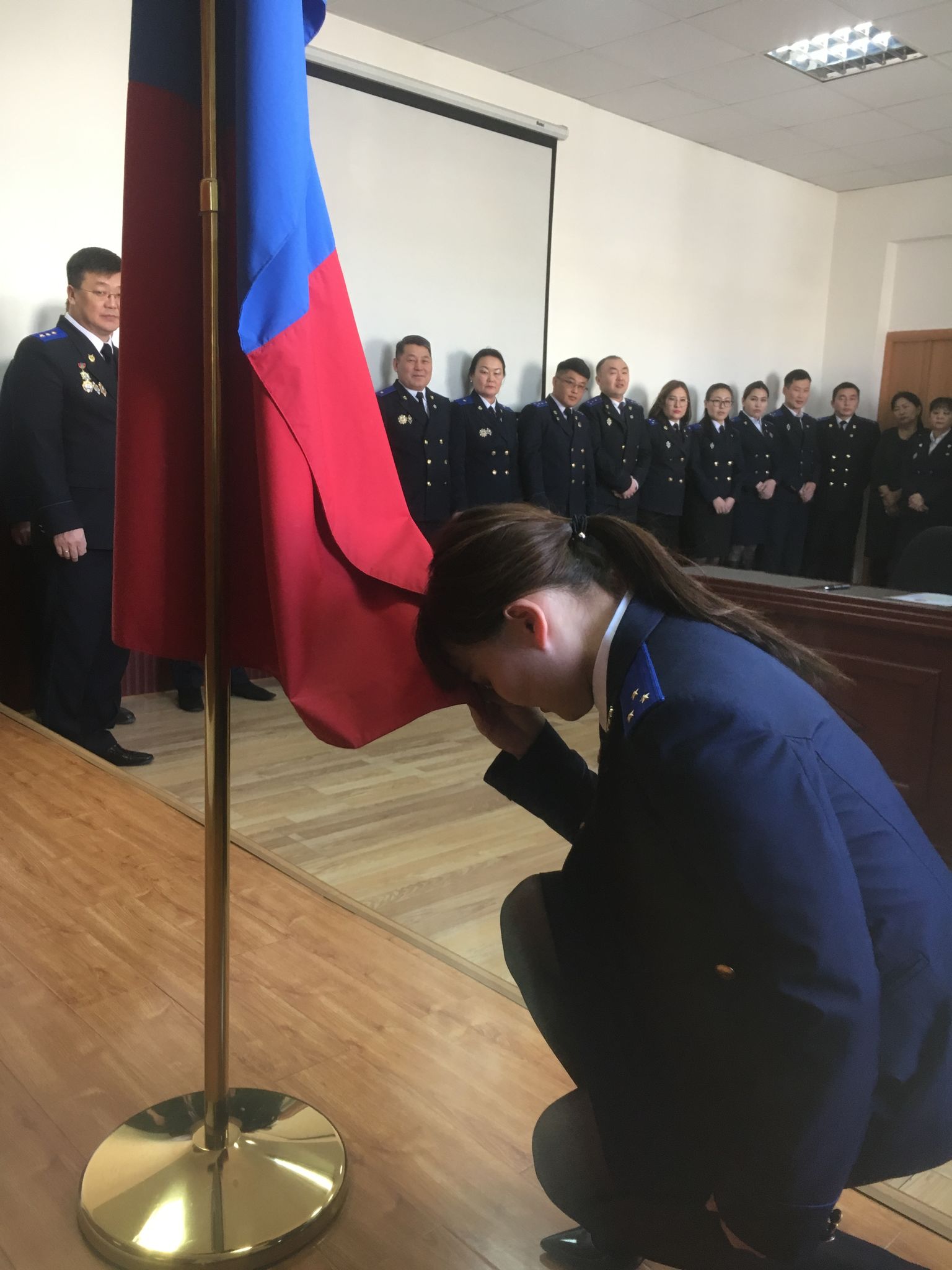Монгол Улсын Ерөнхийлөгчийн 2018 оны 01 дүгээр сарын 31-ний өдрийн 07 дугаартай зарлигийн хавсралтаар батлагдсан “Прокурорын тангараг өргөх ёслолын журам”-д заасны дагуу тус дүүргийн прокурорын газрын хэрэг бүртгэх, мөрдөн байцаах ажиллагаанд тавих хяналт хариуцсан ахлах прокурор, хууль цаазын итгэмжит зөвлөх Г.Батбаяр удирдан явуулсан бөгөөд ёслолын ажиллагаанд бүх прокурор, ажилтнууд оролцож, хяналтын прокурор Ц.Ганцэцэгийн цаашдын ажил үйлсэд өндөр амжилт хүсэж баяр хүргэлээ.