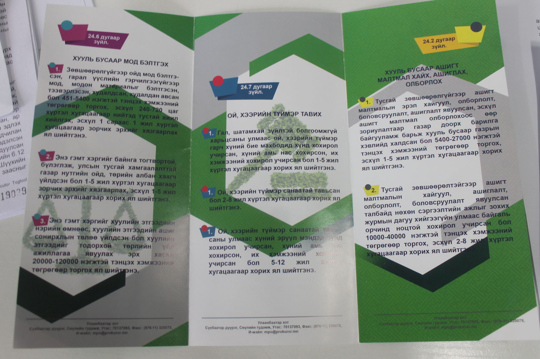 Монгол Улсад Гэмт хэргээс урьдчилан сэргийлэх ажлыг зохицуулах зөвлөлийн ажлын албанаас Хүрээлэн байгаа орчны эсрэг гэмт хэрэг, зөрчлөөс урьдчилан сэргийлэх “Байгалиа хамгаалья” нэгдсэн арга хэмжээний хүрээнд Нийслэлийн прокурорын газраас 5 дугаар сарын 08-ны өдөр Нийслэлийн шүүхийн шийдвэр гүйцэтгэх газрын Хорихоос өөр төрлийн ял эдлүүлэх хэлтэстэй хамтран Хан-Уул дүүргийн нутаг дэвсгэрт Туул голын ай сав орчмыг цэвэрлэх ажлыг зохион байгууллаа. Дээрх ажилд нийтэд тустай ажил хийлгэх ялаар шийтгэгдсэн 60 ялтан хамрагдаж, Маршалын гүүрнээс Зайсангийн гүүр хүртэл 2,5 км газрын хог хаягдлыг цэвэрлэн, тус дүүргийн тохижилт, нийтийн аж ахуйн хэлтсийн ажилтанд хүлээлгэн өгсөн байна. Нэгдсэн арга хэмжээний явцад прокурорууд Хүрээлэн байгаа орчны эсрэг гэмт хэргийн талаар ялтнуудад яриа, таниулга хийж, гэмт хэргээс урьдчилан сэргийлэх чиглэлээр сурталчилгааны материал брошурыг тараан өгчээ.Нийслэлийн Прокурорын газраас мэдээллээ.