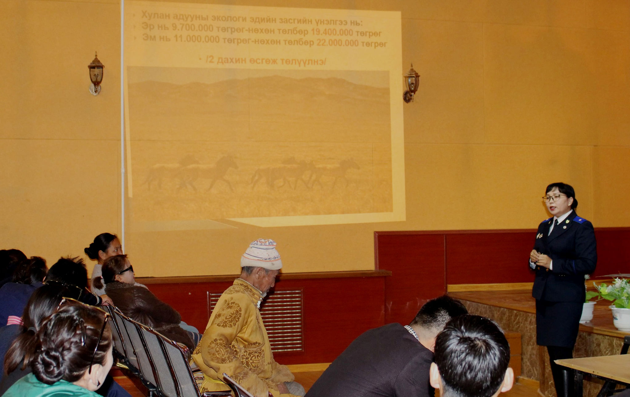 Өдөрлөгийн үеэр гэмт хэргээс урьдчилан сэргийлэх ажилд иргэд, олон нийт хэрхэн оролцох, хүрээлэн байгаа орчны эсрэг гэмт хэрэг, байгаль орчин амьтан, ургамлыг хамгаалах журмын эсрэг болон гэр бүлийн хүчирхийллийн зөрчлийн хэргийн ойлголт, хүлээлгэх хариуцлагын талаар 1200 орчим хүнд яриа таниулга хийж, гарын авлага тараасан байна.