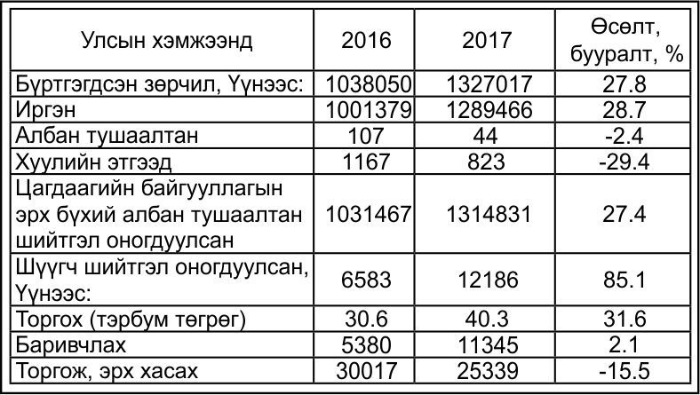 Öàãäààãèéí áàéãóóëëàãàä 2017 оíä 1327017 çөðчèë á¿ðòãýãäýж, 12894665 èðãýí, 44 àëáàí òóшààëòàí, 823 õóóëèéí ýòãýýäýä шèéòãýë оíоãäóóëñàí áàéíà 6. Óëñûí õýмжýýíä á¿ðòãýãäñýí çөðчèë, ò¿¿íèéã шàëãàí шèéäâýðëýõ àжèëëàãààã õ¿ñíýãòýýð õàðóóëáàë: