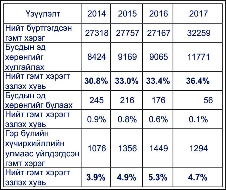 Моíãоë Óëñûí õýмжýýíä 2017 оíä 32259 ãýмò õýðýã á¿ðòãýãäñýí íü өмíөõ оíû мөí ¿еýñ 5092 õýðãýýð áóюó 18.7 õóâèàð өññөí áөãөөä çàðèм òөðëèéí ãýмò õýðýã áóюó өмчëөõ ýðõèéí ýñðýã ãýмò õýðýã 4,840 (36.3%), õ¿íèé àмü áèе, ýð¿¿ë мýíäèéí ýñðýã ãýмò õýðýã 842 (9.7%), õ¿¿õýä, ãýð á¿ë, íèéãмèéí ёñ ñóðòàõóóíû ýñðýã ãýмò õýðýã 189 áóюó 49.2% õóâèàð òóñ òóñ өññөí ñòàòèñòèê òооí ¿ç¿¿ëýëòòýé áàéíà. Гýмò õýðýã өñөõөä шèíýýð áàòëàãäñàí Эð¿¿ãèéí õóóëü òоãòоомжèéí õýðýãжèëò áоëоí áóñàä ямàð шàëòãààí, íөõцөë íөëөөëñíèéã áоäèòооð òоãòооõ, ¿íýëýõ шààðäëàãûí ¿¿äíýýñ ýíýõ¿¿ ñóäàëãààã õèéëýý3.
