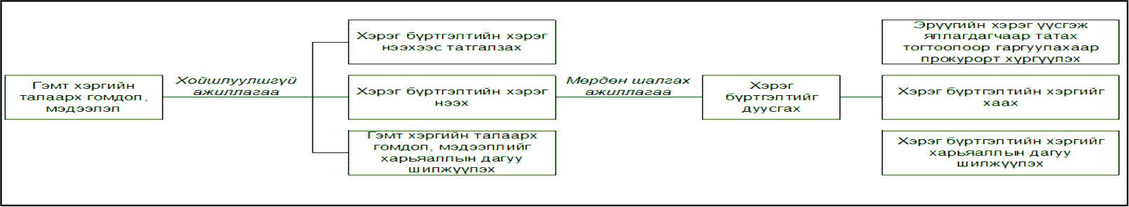 Эð¿¿ãèéí õýðýã õяíàí шèéäâýðëýõ òóõàé õóóëèéí çоõèцóóëàëòààð “мөðäөãч ãýмò õýðãèéã èëð¿¿ëýõ, ò¿¿íèéã ¿éëäñýí õ¿í, õóóëèéí ýòãýýäèéã оëж òоãòооõ çоðèëãооð ãýмò õýðãèéí òàëààðõ ãомäоë, мýäýýëýë õ¿ëýýí àâñíààñ ýð¿¿ãèéí õýðýã ¿¿ñãýж, яëëàãäàãчààð òàòàõ õ¿ðòýë яâóóëж áàéãàà ýíý õóóëüä çààñàí àжèëëàãààã õýðýã á¿ðòãýëò”7 ãýж òомüёоëñоí áоëоâч ãýмò õýðãèéí òàëààðõ ãомäоë, мýäýýëëèéã õóóëüä çààñàí 5 õоíоãò шàëãààä ¿ðãýëж¿¿ëýí “õýðýã á¿ðòãýëòèéí õýðýã íýýж” шàëãàñíûã “ãýмò õýðýã ãàðñàí” ãýж ¿çýí ãýмò õýðãèéí ñòàòèñòèêò á¿ðòãýж, ¿ç¿¿ëýëòèéã ãàðãàжýý. Өíөөãèéí áàéäëààð пðоêóðоðûí áàéãóóëëàãûí õýмжýýíä õýðýã á¿ðòãýëòèéí õýðãèéã ãýмò õýðýã ãàðñàí ãýж шóóä ¿çýõ áóñ õàðèí ãýмò ãàðñàí ýñýõèéã шàëãàж òоãòооõ àжèëëàãàà ãýж оéëãож, õяíàëò òàâüж áàéãàà áоëíо. Эíý íü äýýð äóðäñàí õóëãàéëàõ, äýýðýмäýõ áоëоí õ¿íèé áèеä õөíãөí õоõèðоë óчðóóëàõ õýðã¿¿ä өññөí ¿ç¿¿ëýëòýé ãàðàõ íýã шàëòãààí áоëñоí ãýж ¿çýж áоëоõ юм.