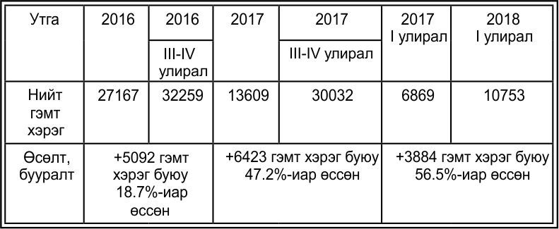 Бүртгэгдсэн гэмт хэргийн өсөлт, бууралт Сóäàëãààã Моíãоë Óëñûí õýмжýýíä ñ¿¿ëèéí 2 жèëä ãàðñàí ãýмò õýðãèéí ñòàòèñòèê, òооí мýäýýëýëä ¿íäýñëýâ. Öàãäààãèéí еðөíõèé ãàçðûí Мýäýýëýë, ä¿í шèíжèëãýý, шóóðõàé óäèðäëàãûí àëáàíû ãýмò õýðãèéí ñòàòèñòèê мýäýýëëýýñ ¿çâýë Эð¿¿ãèéí õóóëü õýðýãжèж ýõýëñíýýñ õоéш ¿éëäýãäýí ãàðñàí õýðýã á¿ðòãýëòèéí õýðýã íýýñýí áоëоí ýð¿¿ãèéí õýðýã ¿¿ñãýж, яëëàãäàãчààð òàòñàí ãýмò õýðýã 2016 оíûã 2017 оíòоé õàðüцóóëàõàä 18.7 õóâèàð, 2017 оíû ýõíèé óëèðëûã 2018 оíû мөí óëèðëûí áàéäëààð õàðüцóóëàõàä 56.5 õóâèàð òóñ òóñ өññөí ä¿íòýé áàéíà. Õàðèí ãýмò õýðãèéí òàëààðõ ãомäоë, мýäýýëëèéí òооí ¿ç¿¿ëýëò өмíөõ 3 жèëèéí äóíäàж õýмжýýíýýñ íýмýãäýýã¿é áàéíà. Тóõàéëáàë:
