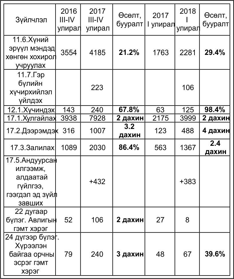 2016 оны 7 дугаар сараас 12 сар, 2017 оны 7 дугаар сараас 12 сар буюу хагас жилийн байдлаар авч үзвэл хулгайлах гэмт хэрэг 2 дахин, дээрэмдэх гэмт хэрэг (булаах гэмт хэргийг дээрэмдэх гэмт хэрэгт тооцсон) 3 дахин, гэр бүлийн хүчирхийлэл 1 хувиар нэмэгдсэн өсөлт нь тухайн хэргүүдийн үйлдэл тус бүрт хэрэг бүртгэлтийн дугаар авч байгаа болон дээр дурдсаны дагуу гэмт хэргийн талаарх гомдол, мэдээлэлд хэрэг бүртгэлтийн хэрэг нээж, шалгах тохиолдолд өссөн байна.
