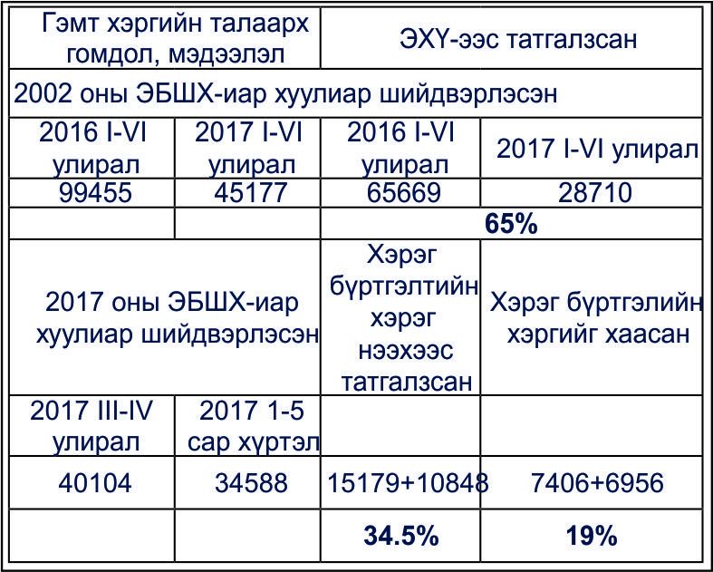 - Мөн 2002 оноос өмнө хэрэгжиж ЭБШХ-д хохирогчтой эвлэрснээр эрүүгийн хэргийг хэрэгсэхгүй болгож шийдвэрлэдэг байсан заалтыг өөрчилж, нотлогдсон гэмт хэргийг заавал шүүхээр шийдвэрлэж гэм буруу, хохирлын асуудлыг эцэслэн шийдвэрлэж байна. Тухайлбал, 2016 онд прокуророос 21712 эрүүгийн хэргийг хэрэгсэхгүй болгож шийдвэрлэж байсан бол 2017 онд 612 хэргийг хэрэгсэхгүй болгож шийдвэрлэн, 2017 оны 7 дугаар сарын 1-нээс хойш бүх эрүүгийн хэргийг шүүхээр эцэслэн шийдвэрлэж байна. Иймээс Эрүүгийн шүүхийн ачаалал 3 дахин нэмэгдсэн тоон мэдээ гарч байна гэж дүгнэж болох юм.