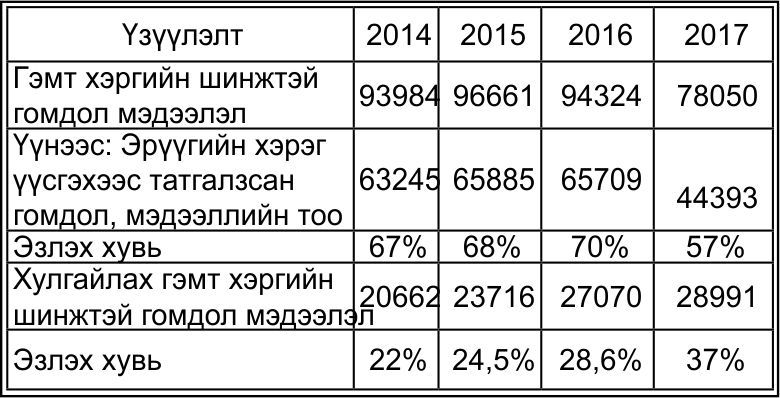 [1] Монгол Улс дах гэмт хэргийн статистикийн үйл ажиллагааны өнөөгийн байдал: SWOT шинжилгээ” судалгааны тайлан 2017 он. 10 дах тал. ХСИС, ЭШХХүрээлэн. Судлаачдын баг