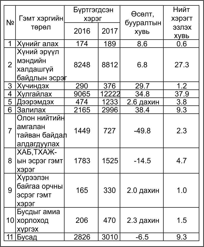 Эрүүгийн хуулийн 11.7-д заасан Гэр бүлийн хүчирхийлэл үйлдэх гэмт хэрэг 223, 17.5-д заасан Андуурсан илгээмж, алдаатай гүйлгээ, гээгдэл эд зүйл завших гэмт хэрэг 432, Эрүүгийн хуулийн 24 дүгээр бүлэгт заасан Хүрээлэн байгаа орчны эсрэг гэмт хэрэг 240 тус тус бүртгэгдсэн нь “тухайн жилд дунджаар 1000 орчим хэрэг бүртгэлтийн хэрэг нээсэн, эрүүгийн хэрэг үүсгэсэн хэрэг нэмэгдсэнийг” харуулж байна.