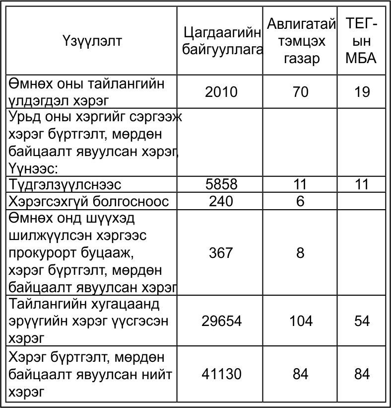 Харин прокурорын байгууллага нь 36574 хэрэг бүртгэлтийн хэрэг нээж, 6419 хэрэгт эрүүгийн хэрэг үүсгэж, хяналт тавьж ажилласан бол Эрүүгийн хэргийн анхан шатны шүүх 10390 хэргийг хүлээн авч, 9019 хүнд ял шийтгэл хүлээлгэсэн байна.