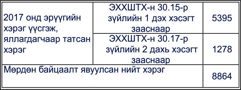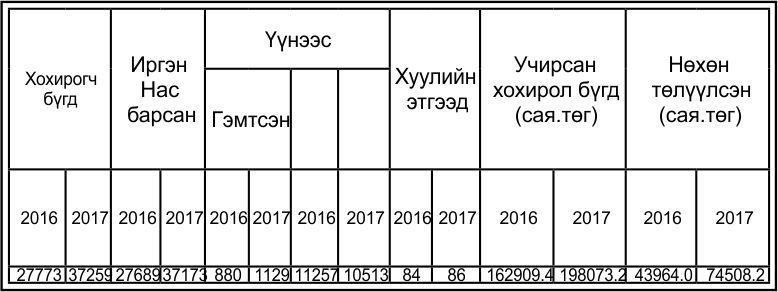 Прокурорын байгууллагын мэдээнээс үзвэл, гэмт хэргийн улмаас учирсан хохирол 2017 онд 198.1 тэрбум төгрөг, нөхөн төлүүлсэн хохирлын хэмжээ 74.5 тэрбум төгрөг болж, өмнөх оноос учирсан хохирол 35.2 тэрбум төгрөг, нөхөн төлүүлсэн хохирол 30.5 тэрбум төгрөгөөр өссөн байна.
