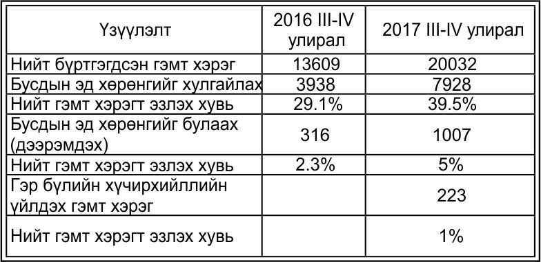 Дээрх хугацаанд бүртгэгдсэн гэмт хэрэг өссөн байх бөгөөд Цагдаагийн байгууллага 2017 оны гэмт хэргийн статистик мэдээг шинээр хэрэгжиж эхэлсэн 2015 оны Монгол Улсын Эрүүгийн хууль, 2002 оны Эрүүгийн хууль гэсэн хоёр байдлаар гаргажээ. Эрүүгийн хууль 2017 оноос (шинэчилсэн найруулга) үйлчилж эхэлснээс өмнө ба хойшх хугацаанд бүртгэгдсэн гэмт хэргийн үзүүлэлтийг жил, улирал тус бүрээр харьцуулж үзвэл хүний эрүүл мэндэд хөнгөн хохирол учруулах гэмт хэрэг 518-аас 731 гэмт хэргээр буюу 21.2-30 хувиар, хүчиндэх гэмт хэрэг 62-97 гэмт хэргээр буюу 69 хувиас 2 дахин, хулгайлах гэмт хэрэг 1697-3990 гэмт хэргээр буюу 2 дахин, дээрэмдэх гэмт хэрэг 365-691 гэмт хэргээр буюу 3.2-4 дахин, Залилах гэмт хэрэг 804-941 гэмт хэргээр буюу 86.4 хувиас 2.4 дахин, авлига албан тушаалын гэмт хэрэг болон хүрээлэн буй орчны эсрэг гэмт хэрэг 2-3 дахин нэмэгдсэн үзүүлэлттэй байна.