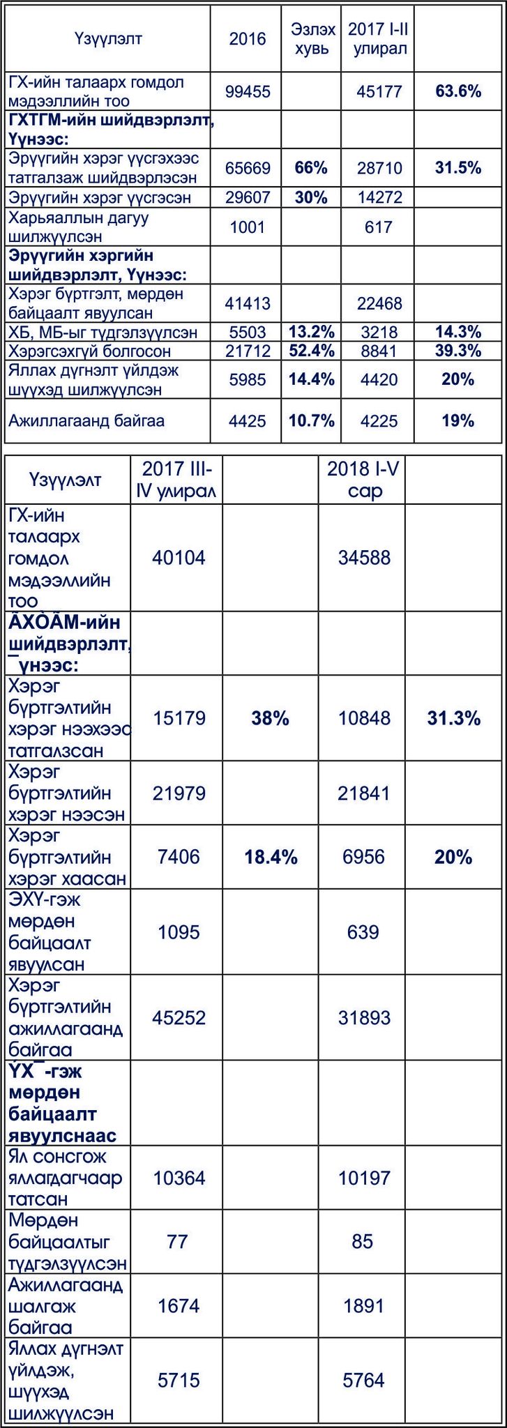 2017 оны 07 дугаар сарын 01-нээс хойш 2018 оны 05 дугаар сарын 31-ний өдөр хүртэлх хугацаанд 67087 гэмт хэргийн талаарх гомдол, мэдээллийн 38947-д буюу 58 хувьд нь хэрэг бүртгэлтийн хэрэг нээж, 26561-ийг буюу 38 орчим хувийг хэрэг бүртгэлтийн хэрэг нээхээс татгалзах саналтайгаар прокурорт шилжүүлж,2689 тохиолдолд буюу4 хувьд нь эрүүгийн хэрэг үүсгэн, яллагдагчаар татаж, мөрдөн байцаалтын ажиллагаа явуулж, үлдэх 2 хувийг харьяаллын дагуу шилжүүлж шийдвэрлэжээ.