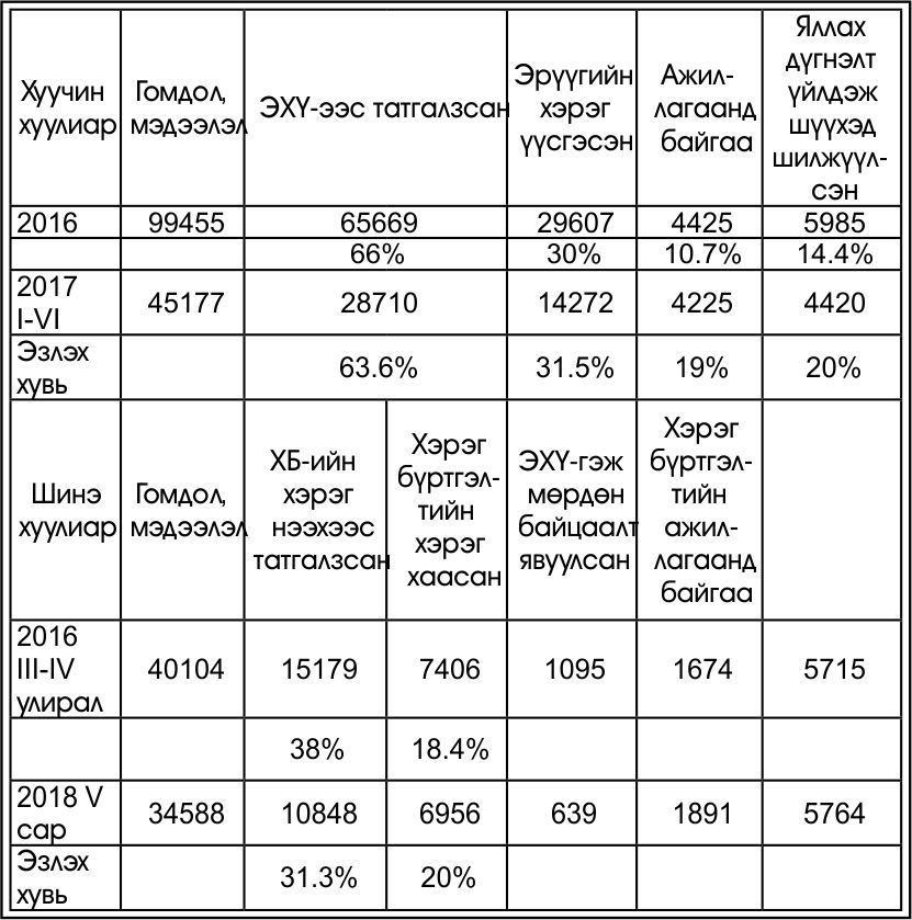 Улсын хэмжээнд бүртгэгдсэн зөрчил, түүнийг шалган шийдвэрлэх ажиллагааг хүснэгтээр харуулбал: