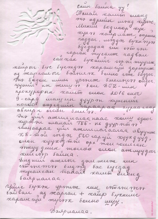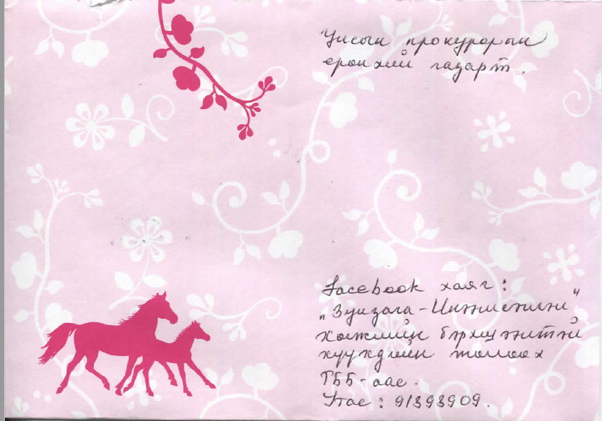 Баянгол дүүргийн прокурорын газрын хамт олонд “Зулзага-инээмсэглэл” Хөгжлийн бэрхшээлтэй хүүхдийн төлөөх Төрийн бус байгууллагаас үйл ажиллагааг нь дэмжин хамтран ажилласанд талархал илэрхийлж, сэтгэлийн үгтэй захиаг “Талархлын бичиг”-ийн хамт илгээсэн байна.