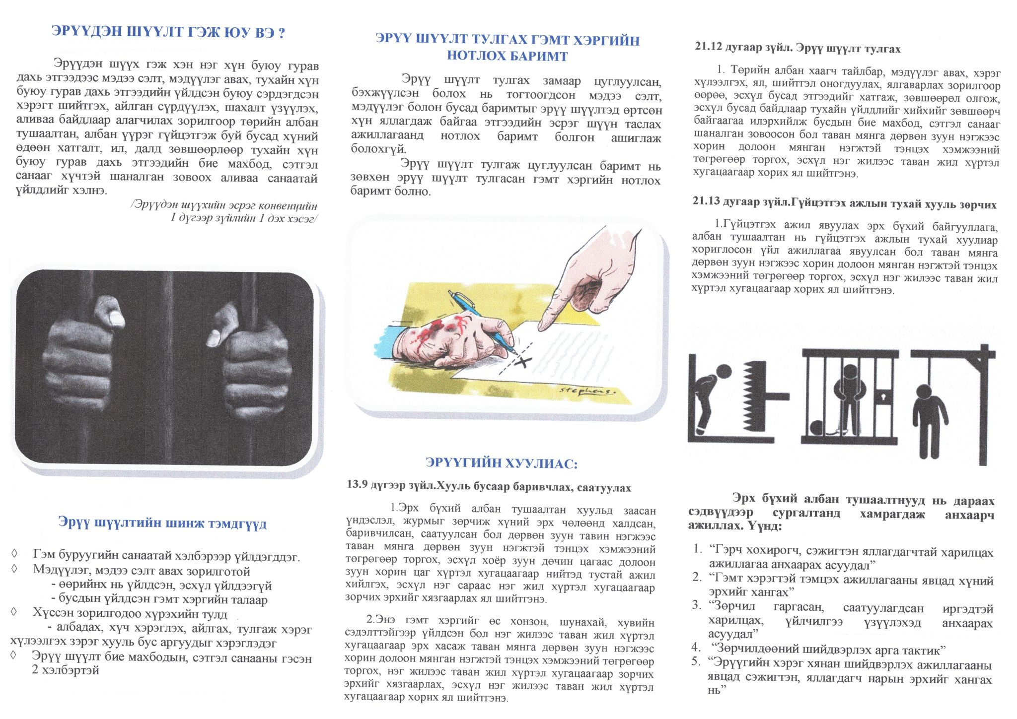Сургалтаар “Эрүүдэн шүүх болон бусад хэлбэрээр хэрцгий, хүнлэг бусаар буюу хүний нэр төрийг доромжлон харьцаж шийтгэхийн эсрэг конвенц” болон Эрүүгийн хуулийн 13.9 дүгээр зүйлд заасан “Хууль бусаар баривчлах, саатуулах”, мөн хуулийн 21.12 дугаар зүйлд заасан “Эрүү шүүлт тулгах” гэмт хэргийн талаарх ойлголтыг өгчээ.