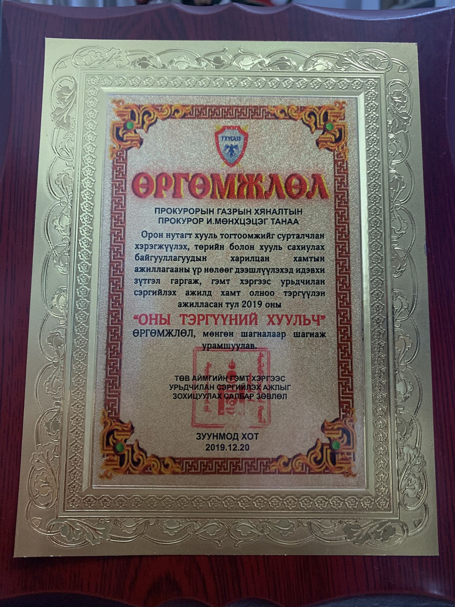 Төв аймгийн Гэмт хэргээс урьдчилан сэргийлэх ажлыг зохицуулах салбар зөвлөлөөс тус аймгийн прокурорын газрын хэрэг бүртгэх, мөрдөн байцаах ажиллагаанд хяналт тавих хяналтын прокурор И.Мөнхцэцэгийг орон нутагт хууль тогтоомжийг сурталчлан хэрэгжүүлэх, төрийн болон хууль сахиулах байгууллагуудын харилцаа хамтын ажиллагааны үр нөлөөг дээшлүүлэхэд үнэтэй хувь нэмэр оруулсныг нь үнэлж, “ОНЫ ТЭРГҮҮНИЙ ХУУЛЬЧ”-аар шалгаруулж, өргөмжлөл, мөнгөн шагналаар шагнаж урамшуулсан байна.