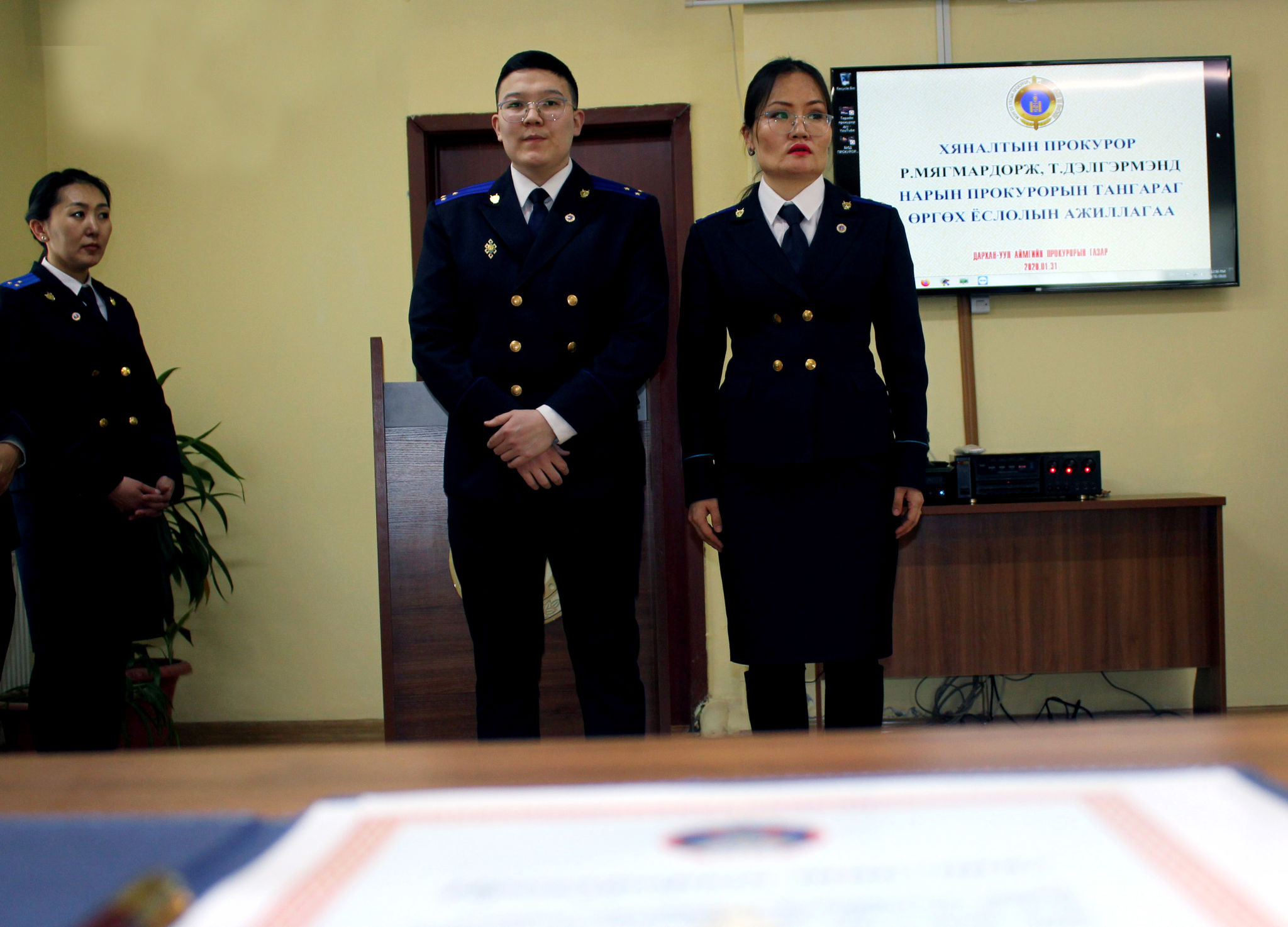 Шинээр томилогдсон прокурор Р.Мягмардорж, Т.Дэлгэрмэнд нарт хамт олны зүгээс баяр хүргэн, өргөсөн тангарагтаа үнэнч шударгаар ажиллан, албан үүргээ нэр төртэй биелүүлэхийг захиж, ажлын өндөр амжилтыг хүсэн ерөөж, дурсгалын зүйл гардууллаа.
