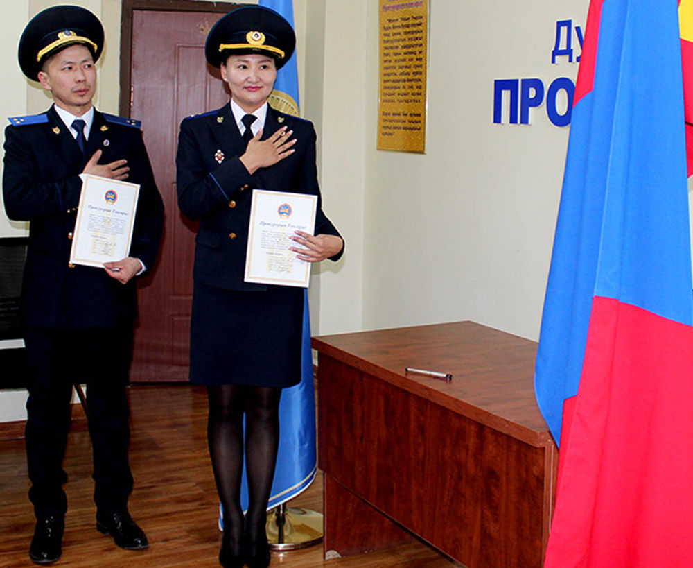 Монгол Улсын Ерөнхийлөгчийн 2018 оны 07 дугаар зарлигаар батлагдсан “Прокурорын тангараг өргөх ёслолын журам”-д заасны дагуу ёслолын ажиллагааг ахлах прокурор Д.Баянмөнх удирдан явуулж, шинээр томилогдсон прокуроруудад аймгийн прокурорын газрын ерөнхий прокурор С.Гансэлэм баяр хүргэж, албаны үүргээ үнэнч, шударгаар биелүүлэн, прокурорын ёс зүй, нэр хүндийг өндөрт өргөж явахыг захиж, дурсгалын зүйл гардуулсан байна.
