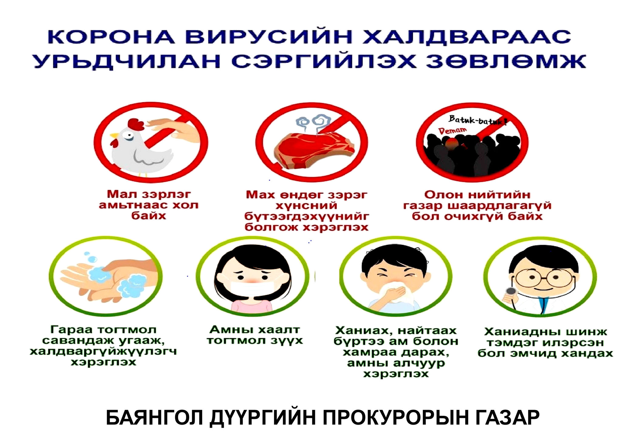 Баянгол дүүргийн прокурорын газрын прокурор, ажилтнууд 2020 оны 2 дугаар сарын 07-ны өдөр томуу, томуу төст өвчин, шинээр илрээд буй Корона вирусын халдвар, түүний ойлголт, хэрхэн урьдчилан сэргийлэх талаар сургалтанд хамрагдлаа. Сургалтыг тус дүүргийн Эрүүл мэндийн нэгдсэн төвийн халдварт өвчний тасгийн эмч Б.Мөнхбаатар болон сургалтын багийн гишүүн удирдан явуулсан байна.