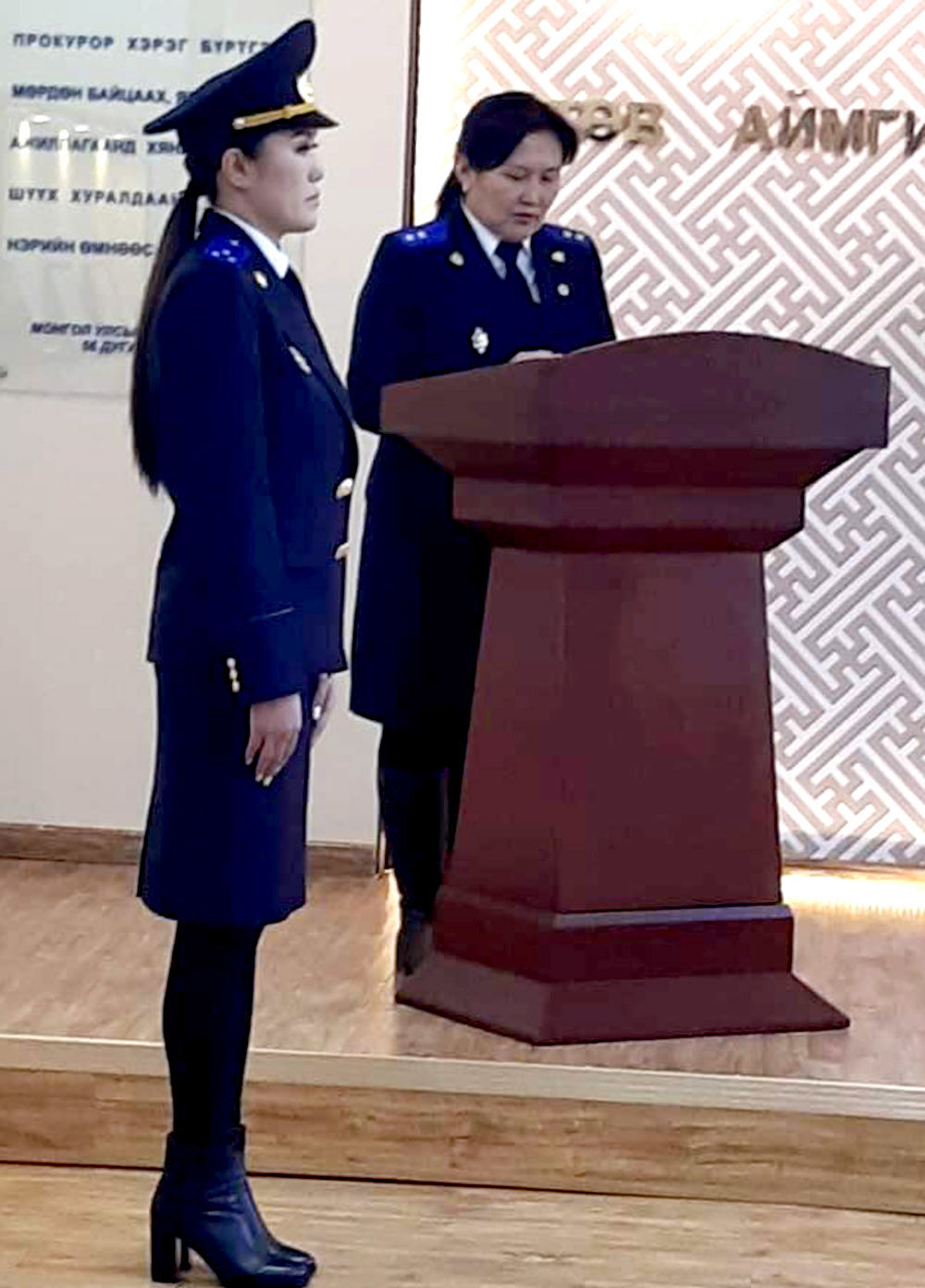 Төв аймгийн прокурорын газарт Монгол Улсын Ерөнхий прокурорын тушаалаар хэрэг бүртгэх, мөрдөн байцаах ажиллагаанд хяналт тавих хяналтын прокуророор томилогдсон А.Азжаргалын “Прокурорын тангараг” өргөх ёслолын ажиллагааг 2020 оны 2 дугаар сарын 05-ны өдөр зохион байгууллаа.