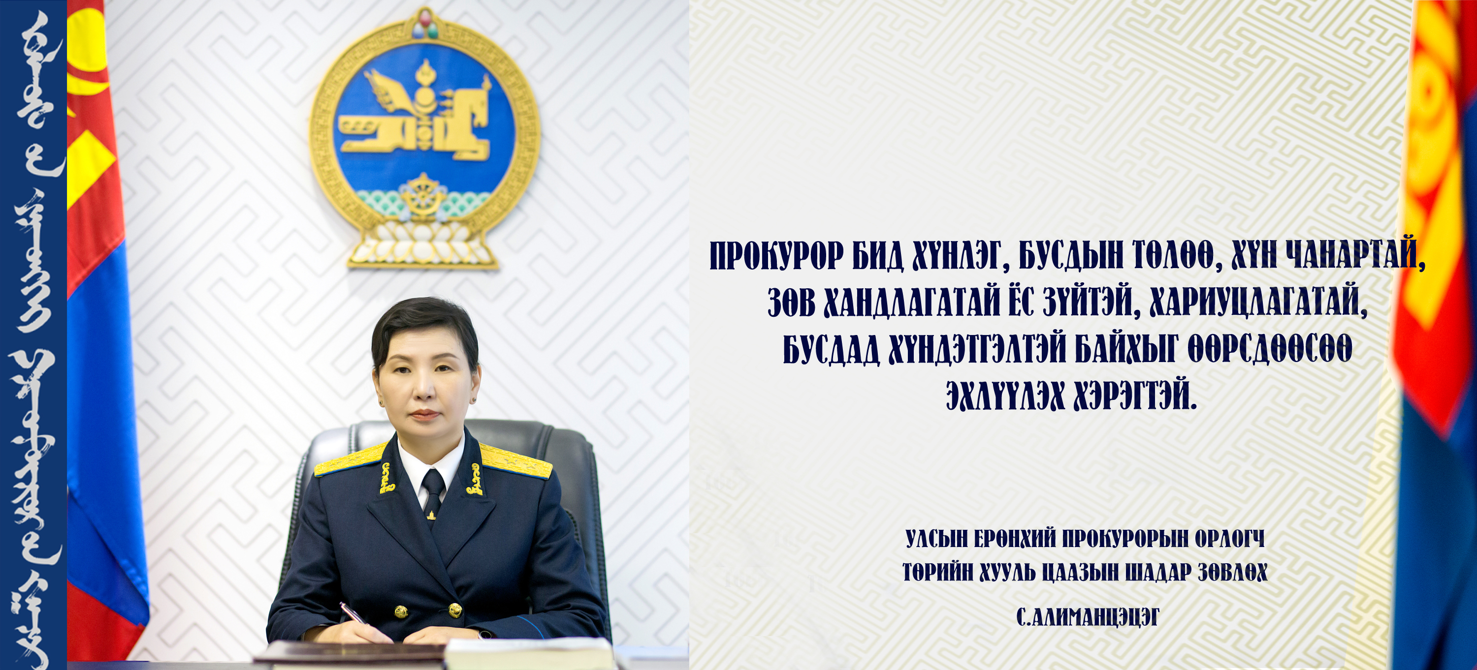 Өнөөдөр Улсын Ерөнхий прокурорын орлогч С.Алиманцэцэг, Улсын Ерөнхий прокурорын туслах прокурор, Дотоод хяналт шалгалтын хэлстийн дарга М.Оюундэлгэр, Улсын Ерөнхий прокурорын туслах прокурор, Бодлого төлөвлөлт, хууль эрх зүйн хэлтсийн дарга Д.Баянжаргал гээд нэр хүндтэй хуульч эрх зүйч эмэгтэйчүүд прокурорын байгууллагын өндөр дээд албан тушаалыг хашиж байна.