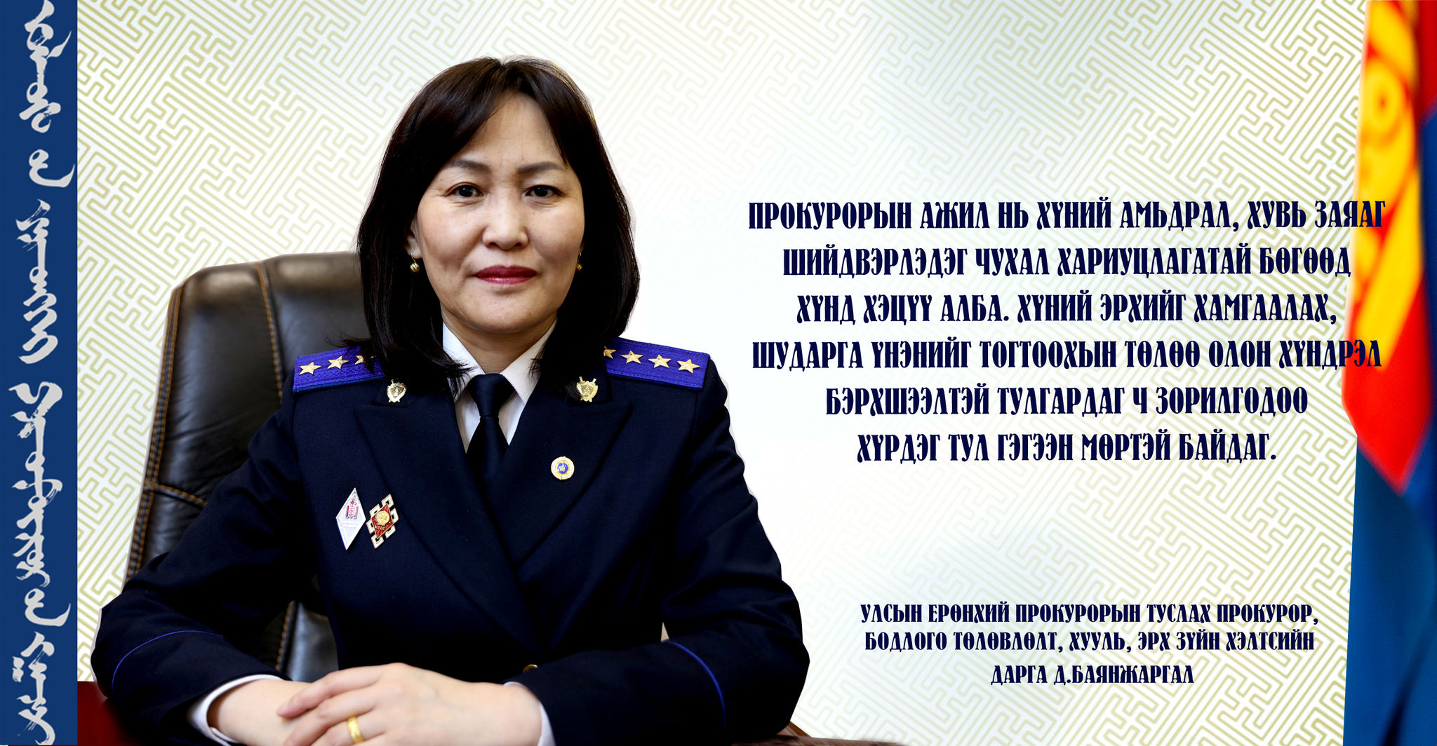Эмэгтэй хүний нарийн холч ухаан, мэдрэмж, хөрвөх чадвар, тэвчээр хатуужил прокурор хэмээх амаргүй хэдий ч хариуцлагатай албыг нэр төртэй биелүүлэхэд яахын аргагүй түлхэц болдог.