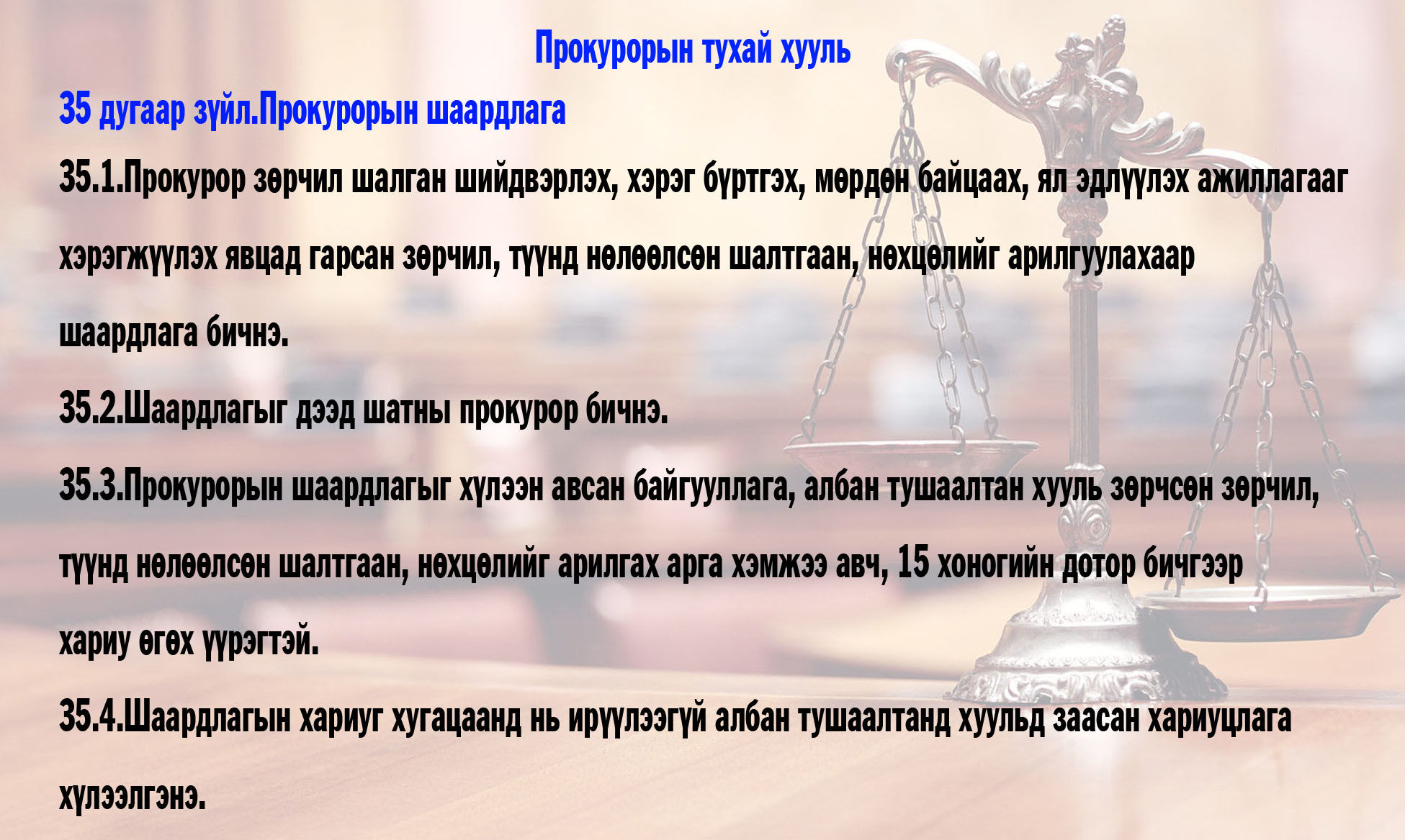 Судалгааны дүн, прокурорын хяналтаар илрүүлсэн зөрчлийг Улсын Ерөнхий прокурорын дэргэдэх зөвлөлийн хуралдаанаар хэлэлцүүлсэн. Зөвлөлийн хуралдаанаар хууль, заавар, журам зөрчсөн зөрчил, түүнд нөлөөлсөн шалтгаан нөхцлийг арилгуулах, давтан гаргуулахгүй байхад чиглэсэн удирдлага зохион байгуулалтын тодорхой арга хэмжээ авахуулах нь зүйтэй гэж шийдвэрлэсэн. Улмаар Прокурорын тухай хууль, Зөрчил шалган шийдвэрлэх тухай хуулийн дагуу Цагдаагийн Ерөнхий газрын даргын нэр дээр прокурорын шаардлага бичиж хүргүүлсэн.