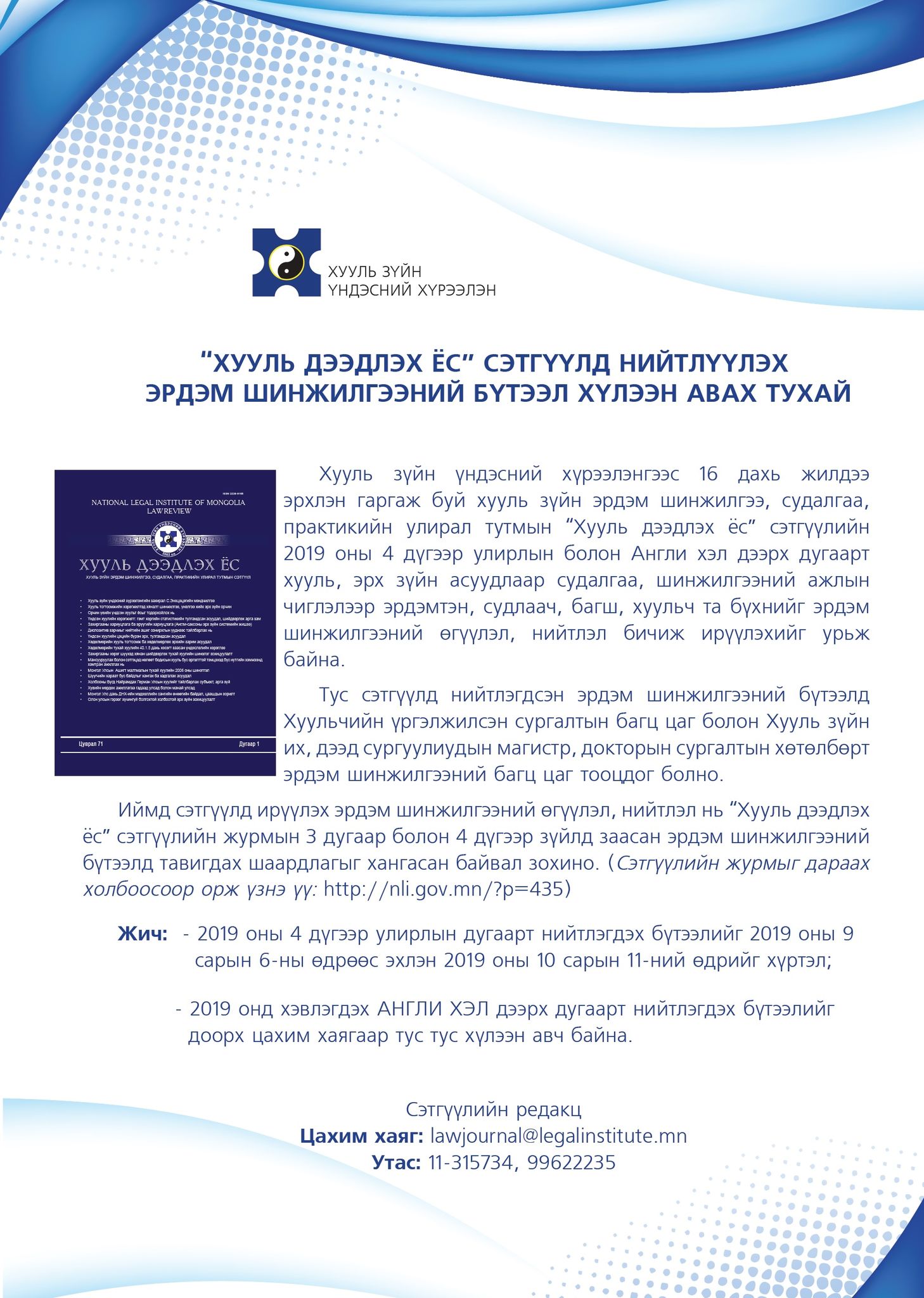 "ХУУЛЬ ДЭЭДЛЭХ ЁС" СЭТГҮҮЛД НИЙТЛҮҮЛЭХ ЭРДЭМ ШИНЖИЛГЭЭНИЙ БҮТЭЭЛИЙГ ХҮЛЭЭН АВЧ БАЙНА.